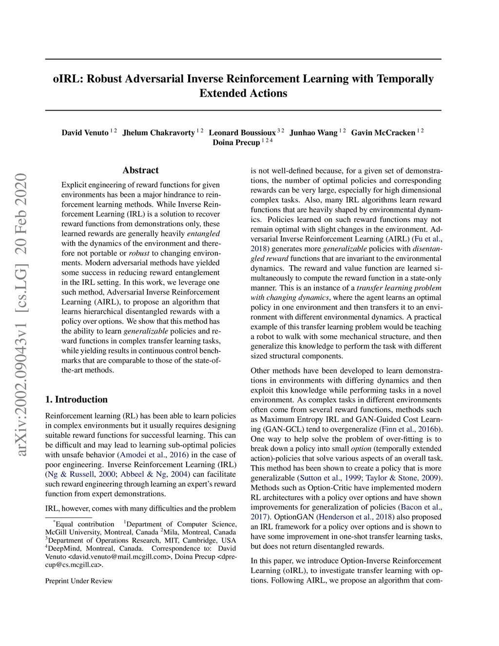 Explicit engineering of reward functions for given environments has been a major hindrance to reinforcement learning methods. While Inverse Reinforcement Learning (IRL) is a solution to recover reward functions from demonstrations only, these learned rewards are generally heavily \textit{entangled} with the dynamics of the environment and therefore not portable or \emph{robust} to changing environments. Modern adversarial methods have yielded some success in reducing reward entanglement in the IRL setting. In this work, we leverage one such method, Adversarial Inverse Reinforcement Learning (AIRL), to propose an algorithm that learns hierarchical disentangled rewards with a policy over options. We show that this method has the ability to learn \emph{generalizable} policies and reward functions in complex transfer learning tasks, while yielding results in continuous control benchmarks that are comparable to those of the state-of-the-art methods.