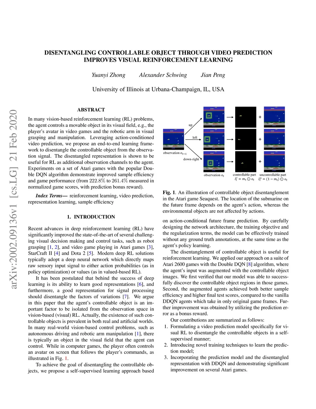 In many vision-based reinforcement learning (RL) problems, the agent controls a movable object in its visual field, e.g., the player's avatar in video games and the robotic arm in visual grasping and manipulation. Leveraging action-conditioned video prediction, we propose an end-to-end learning framework to disentangle the controllable object from the observation signal. The disentangled representation is shown to be useful for RL as additional observation channels to the agent. Experiments on a set of Atari games with the popular Double DQN algorithm demonstrate improved sample efficiency and game performance (from 222.8% to 261.4% measured in normalized game scores, with prediction bonus reward).