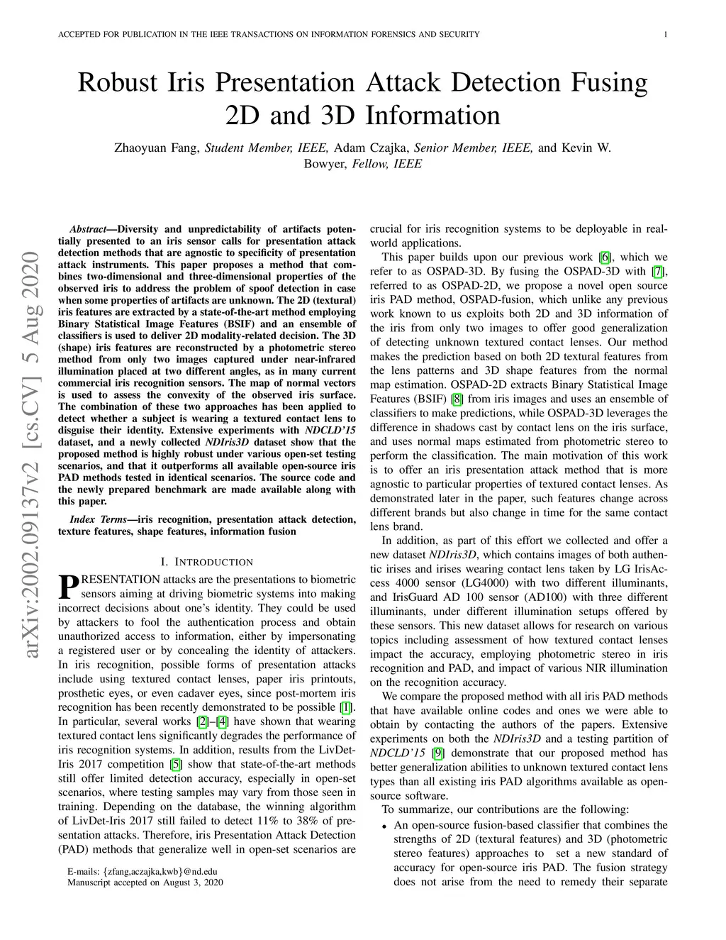 Diversity and unpredictability of artifacts potentially presented to an iris sensor calls for presentation attack detection methods that are agnostic to specificity of presentation attack instruments. This paper proposes a method that combines two-dimensional and three-dimensional properties of the observed iris to address the problem of spoof detection in case when some properties of artifacts are unknown. The 2D (textural) iris features are extracted by a state-of-the-art method employing Binary Statistical Image Features (BSIF) and an ensemble of classifiers is used to deliver 2D modality-related decision. The 3D (shape) iris features are reconstructed by a photometric stereo method from only two images captured under near-infrared illumination placed at two different angles, as in many current commercial iris recognition sensors. The map of normal vectors is used to assess the convexity of the observed iris surface. The combination of these two approaches has been applied to detect whether a subject is wearing a textured contact lens to disguise their identity. Extensive experiments with NDCLD'15 dataset, and a newly collected NDIris3D dataset show that the proposed method is highly robust under various open-set testing scenarios, and that it outperforms all available open-source iris PAD methods tested in identical scenarios. The source code and the newly prepared benchmark are made available along with this paper.