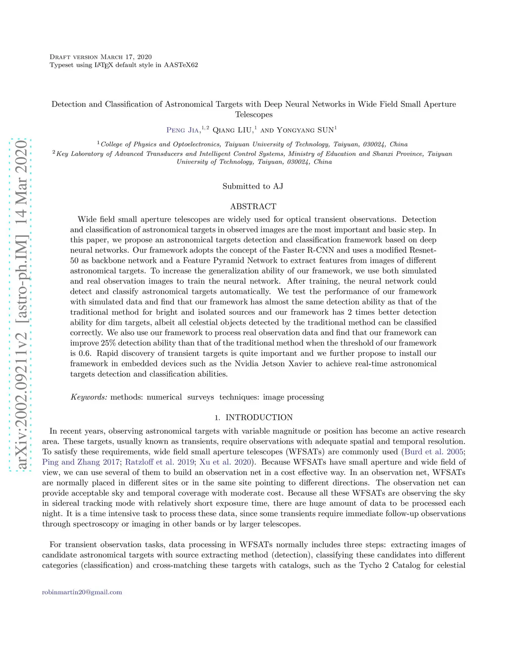 Wide field small aperture telescopes are widely used for optical transient observations. Detection and classification of astronomical targets in observed images are the most important and basic step. In this paper, we propose an astronomical targets detection and classification framework based on deep neural networks. Our framework adopts the concept of the Faster R-CNN and uses a modified Resnet-50 as backbone network and a Feature Pyramid Network to extract features from images of different astronomical targets. To increase the generalization ability of our framework, we use both simulated and real observation images to train the neural network. After training, the neural network could detect and classify astronomical targets automatically. We test the performance of our framework with simulated data and find that our framework has almost the same detection ability as that of the traditional method for bright and isolated sources and our framework has 2 times better detection ability for dim targets, albeit all celestial objects detected by the traditional method can be classified correctly. We also use our framework to process real observation data and find that our framework can improve 25 % detection ability than that of the traditional method when the threshold of our framework is 0.6. Rapid discovery of transient targets is quite important and we further propose to install our framework in embedded devices such as the Nvidia Jetson Xavier to achieve real-time astronomical targets detection and classification abilities.