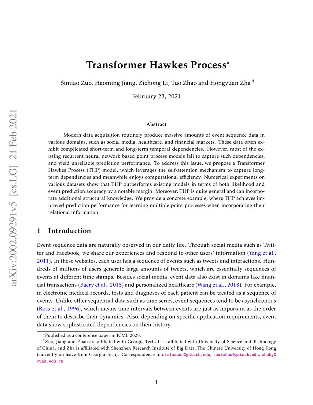 Modern data acquisition routinely produce massive amounts of event sequence data in various domains, such as social media, healthcare, and financial markets. These data often exhibit complicated short-term and long-term temporal dependencies. However, most of the existing recurrent neural network based point process models fail to capture such dependencies, and yield unreliable prediction performance. To address this issue, we propose a Transformer Hawkes Process (THP) model, which leverages the self-attention mechanism to capture long-term dependencies and meanwhile enjoys computational efficiency. Numerical experiments on various datasets show that THP outperforms existing models in terms of both likelihood and event prediction accuracy by a notable margin. Moreover, THP is quite general and can incorporate additional structural knowledge. We provide a concrete example, where THP achieves improved prediction performance for learning multiple point processes when incorporating their relational information.