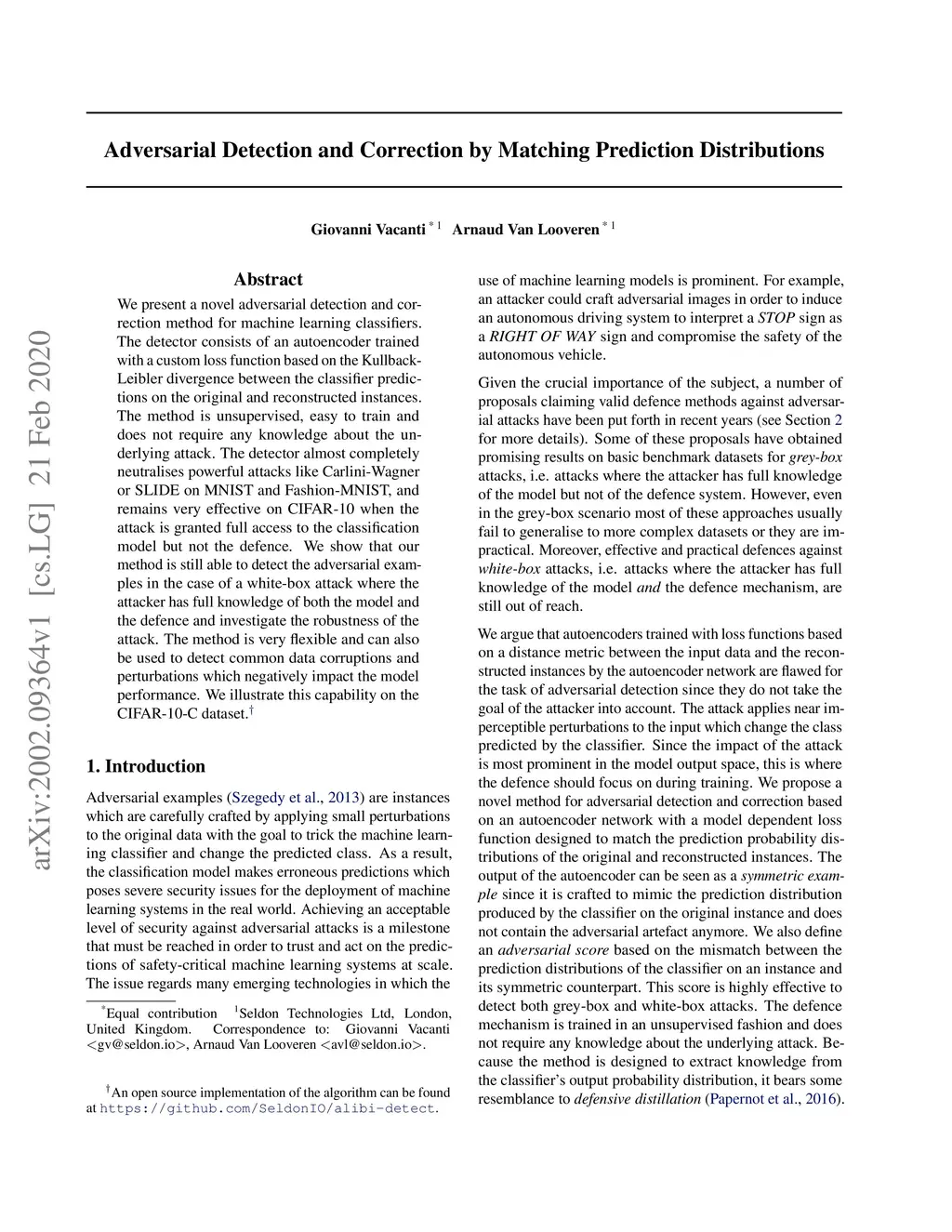 We present a novel adversarial detection and correction method for machine learning classifiers.The detector consists of an autoencoder trained with a custom loss function based on the Kullback-Leibler divergence between the classifier predictions on the original and reconstructed instances.The method is unsupervised, easy to train and does not require any knowledge about the underlying attack. The detector almost completely neutralises powerful attacks like Carlini-Wagner or SLIDE on MNIST and Fashion-MNIST, and remains very effective on CIFAR-10 when the attack is granted full access to the classification model but not the defence. We show that our method is still able to detect the adversarial examples in the case of a white-box attack where the attacker has full knowledge of both the model and the defence and investigate the robustness of the attack. The method is very flexible and can also be used to detect common data corruptions and perturbations which negatively impact the model performance. We illustrate this capability on the CIFAR-10-C dataset.