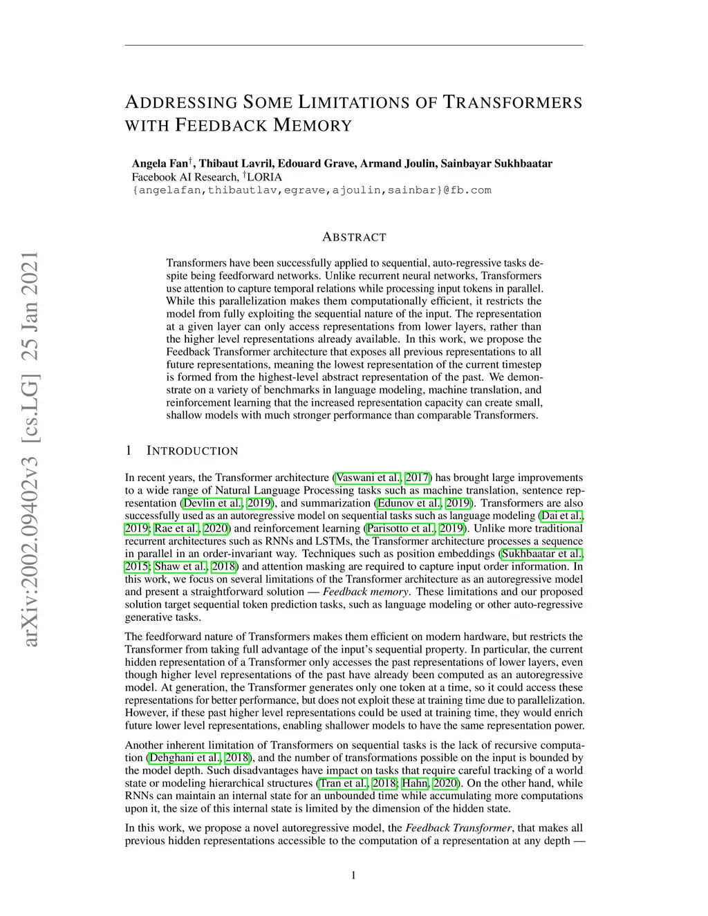 Addressing Some Limitations of Transformers with Feedback Memory