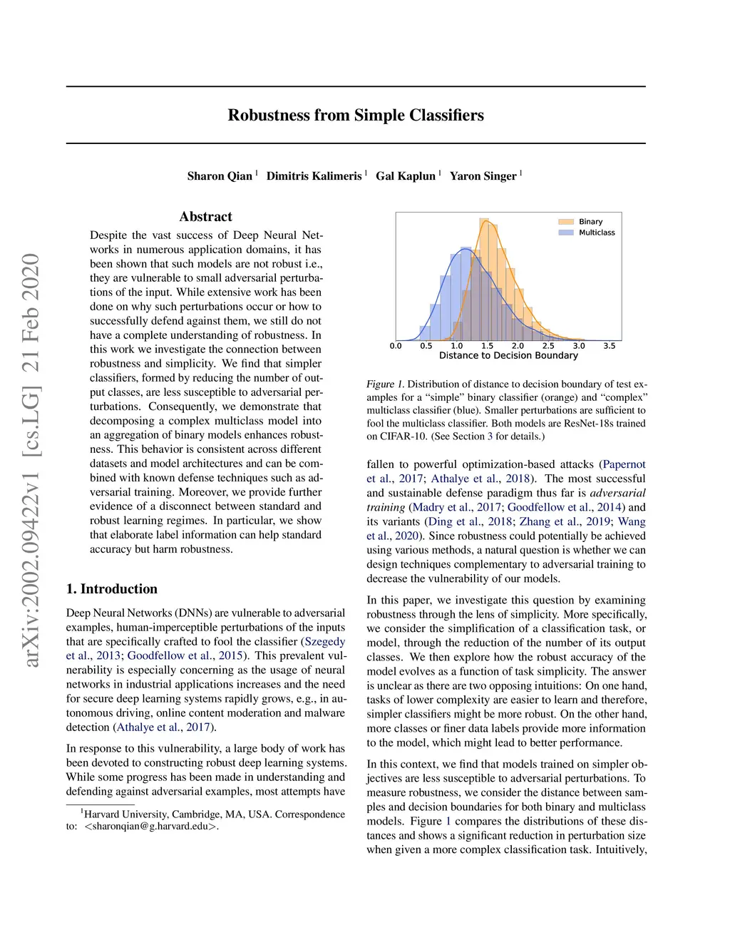 Despite the vast success of Deep Neural Networks in numerous application domains, it has been shown that such models are not robust i.e., they are vulnerable to small adversarial perturbations of the input. While extensive work has been done on why such perturbations occur or how to successfully defend against them, we still do not have a complete understanding of robustness. In this work, we investigate the connection between robustness and simplicity. We find that simpler classifiers, formed by reducing the number of output classes, are less susceptible to adversarial perturbations. Consequently, we demonstrate that decomposing a complex multiclass model into an aggregation of binary models enhances robustness. This behavior is consistent across different datasets and model architectures and can be combined with known defense techniques such as adversarial training. Moreover, we provide further evidence of a disconnect between standard and robust learning regimes. In particular, we show that elaborate label information can help standard accuracy but harm robustness.