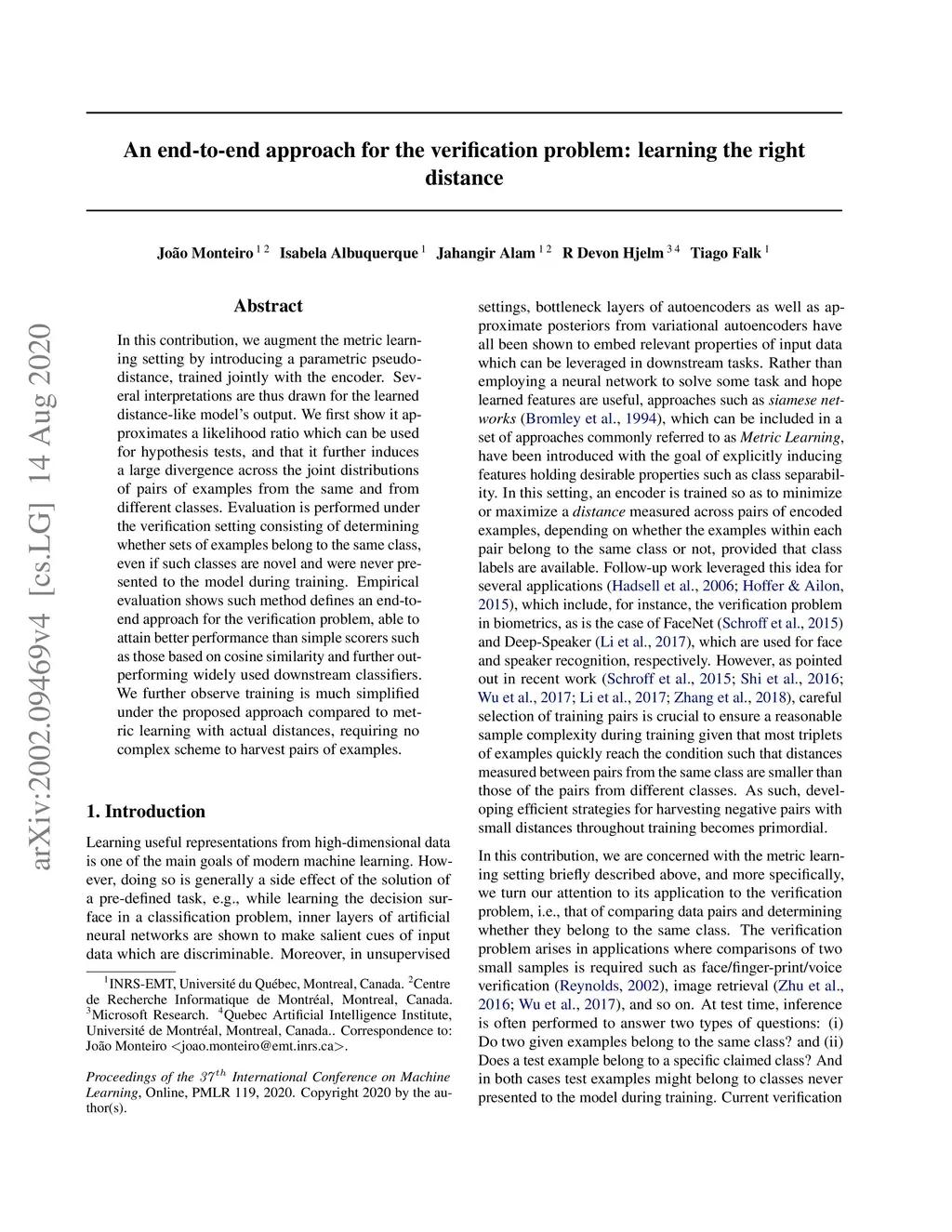 In this contribution, we augment the metric learning setting by introducing a parametric pseudo-distance, trained jointly with the encoder. Several interpretations are thus drawn for the learned distance-like model's output. We first show it approximates a likelihood ratio which can be used for hypothesis tests, and that it further induces a large divergence across the joint distributions of pairs of examples from the same and from different classes. Evaluation is performed under the verification setting consisting of determining whether sets of examples belong to the same class, even if such classes are novel and were never presented to the model during training. Empirical evaluation shows such method defines an end-to-end approach for the verification problem, able to attain better performance than simple scorers such as those based on cosine similarity and further outperforming widely used downstream classifiers. We further observe training is much simplified under the proposed approach compared to metric learning with actual distances, requiring no complex scheme to harvest pairs of examples.