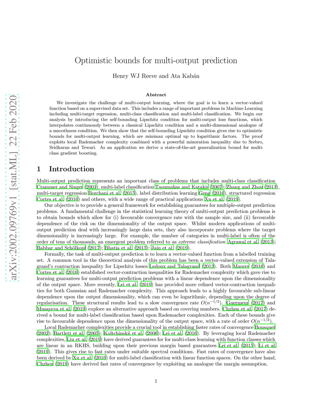 We investigate the challenge of multi-output learning, where the goal is to learn a vector-valued function based on a supervised data set. This includes a range of important problems in Machine Learning including multi-target regression, multi-class classification and multi-label classification. We begin our analysis by introducing the self-bounding Lipschitz condition for multi-output loss functions, which interpolates continuously between a classical Lipschitz condition and a multi-dimensional analogue of a smoothness condition. We then show that the self-bounding Lipschitz condition gives rise to optimistic bounds for multi-output learning, which are minimax optimal up to logarithmic factors. The proof exploits local Rademacher complexity combined with a powerful minoration inequality due to Srebro, Sridharan and Tewari. As an application we derive a state-of-the-art generalization bound for multi-class gradient boosting.