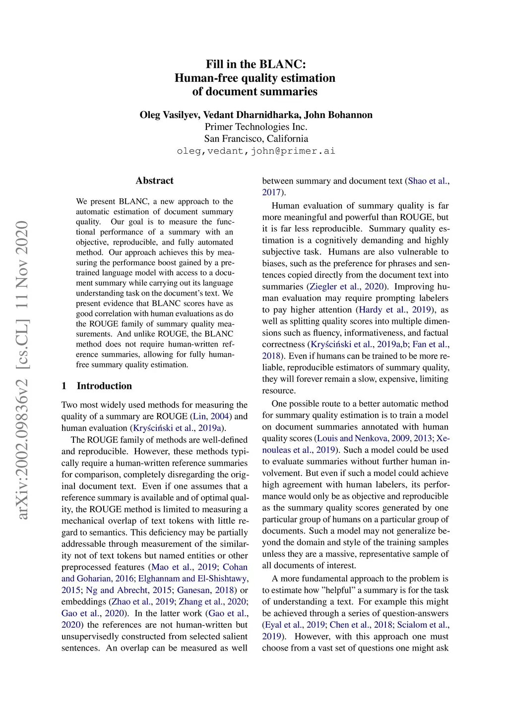 We present BLANC, a new approach to the automatic estimation of document summary quality. Our goal is to measure the functional performance of a summary with an objective, reproducible, and fully automated method. Our approach achieves this by measuring the performance boost gained by a pre-trained language model with access to a document summary while carrying out its language understanding task on the document's text. We present evidence that BLANC scores have as good correlation with human evaluations as do the ROUGE family of summary quality measurements. And unlike ROUGE, the BLANC method does not require human-written reference summaries, allowing for fully human-free summary quality estimation.