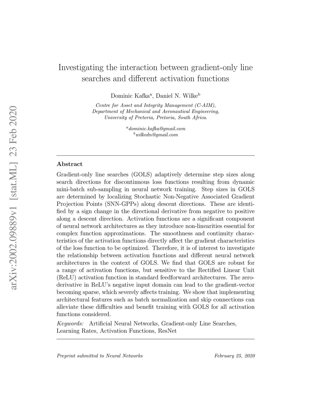 Gradient-only line searches (GOLS) adaptively determine step sizes along search directions for discontinuous loss functions resulting from dynamic mini-batch sub-sampling in neural network training. Step sizes in GOLS are determined by localizing Stochastic Non-Negative Associated Gradient Projection Points (SNN-GPPs) along descent directions. These are identified by a sign change in the directional derivative from negative to positive along a descent direction. Activation functions are a significant component of neural network architectures as they introduce non-linearities essential for complex function approximations. The smoothness and continuity characteristics of the activation functions directly affect the gradient characteristics of the loss function to be optimized. Therefore, it is of interest to investigate the relationship between activation functions and different neural network architectures in the context of GOLS. We find that GOLS are robust for a range of activation functions, but sensitive to the Rectified Linear Unit (ReLU) activation function in standard feedforward architectures. The zero-derivative in ReLU's negative input domain can lead to the gradient-vector becoming sparse, which severely affects training. We show that implementing architectural features such as batch normalization and skip connections can alleviate these difficulties and benefit training with GOLS for all activation functions considered.