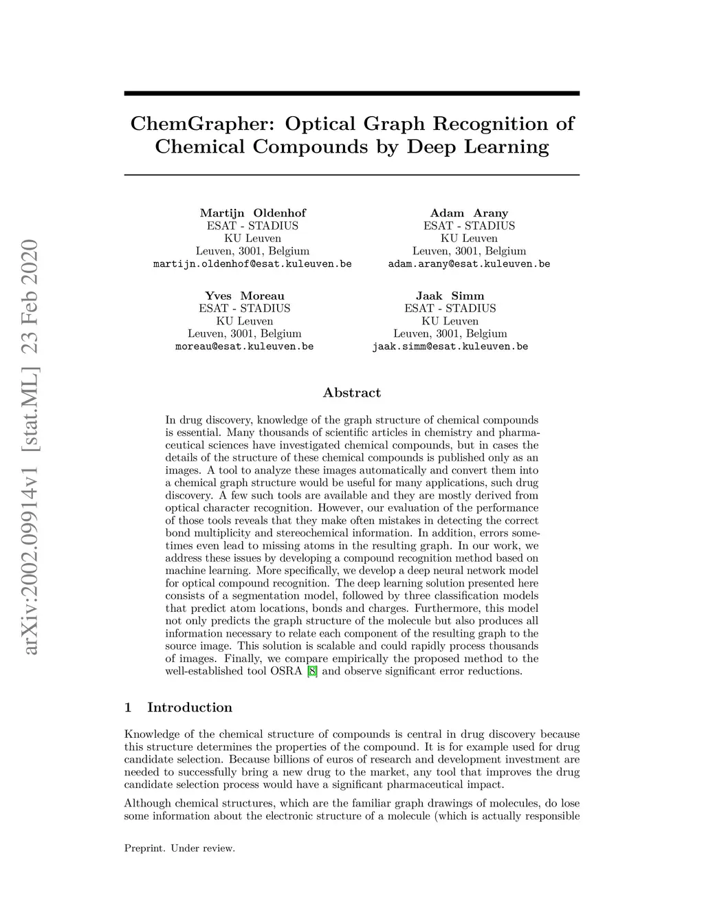 In drug discovery, knowledge of the graph structure of chemical compounds is essential. Many thousands of scientific articles in chemistry and pharmaceutical sciences have investigated chemical compounds, but in cases the details of the structure of these chemical compounds is published only as an images. A tool to analyze these images automatically and convert them into a chemical graph structure would be useful for many applications, such drug discovery. A few such tools are available and they are mostly derived from optical character recognition. However, our evaluation of the performance of those tools reveals that they make often mistakes in detecting the correct bond multiplicity and stereochemical information. In addition, errors sometimes even lead to missing atoms in the resulting graph. In our work, we address these issues by developing a compound recognition method based on machine learning. More specifically, we develop a deep neural network model for optical compound recognition. The deep learning solution presented here consists of a segmentation model, followed by three classification models that predict atom locations, bonds and charges. Furthermore, this model not only predicts the graph structure of the molecule but also produces all information necessary to relate each component of the resulting graph to the source image. This solution is scalable and could rapidly process thousands of images. Finally, we compare empirically the proposed method to a well-established tool and observe significant error reductions.