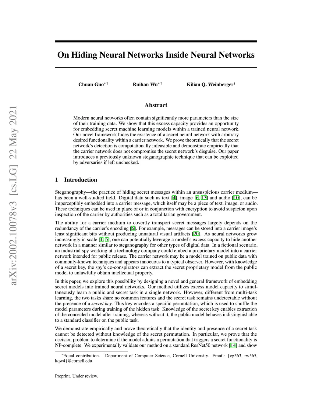 Modern neural networks often contain significantly more parameters than the size of their training data. We show that this excess capacity provides an opportunity for embedding secret machine learning models within a trained neural network. Our novel framework hides the existence of a secret neural network with arbitrary desired functionality within a carrier network. We prove theoretically that the secret network's detection is computationally infeasible and demonstrate empirically that the carrier network does not compromise the secret network's disguise. Our paper introduces a previously unknown steganographic technique that can be exploited by adversaries if left unchecked.