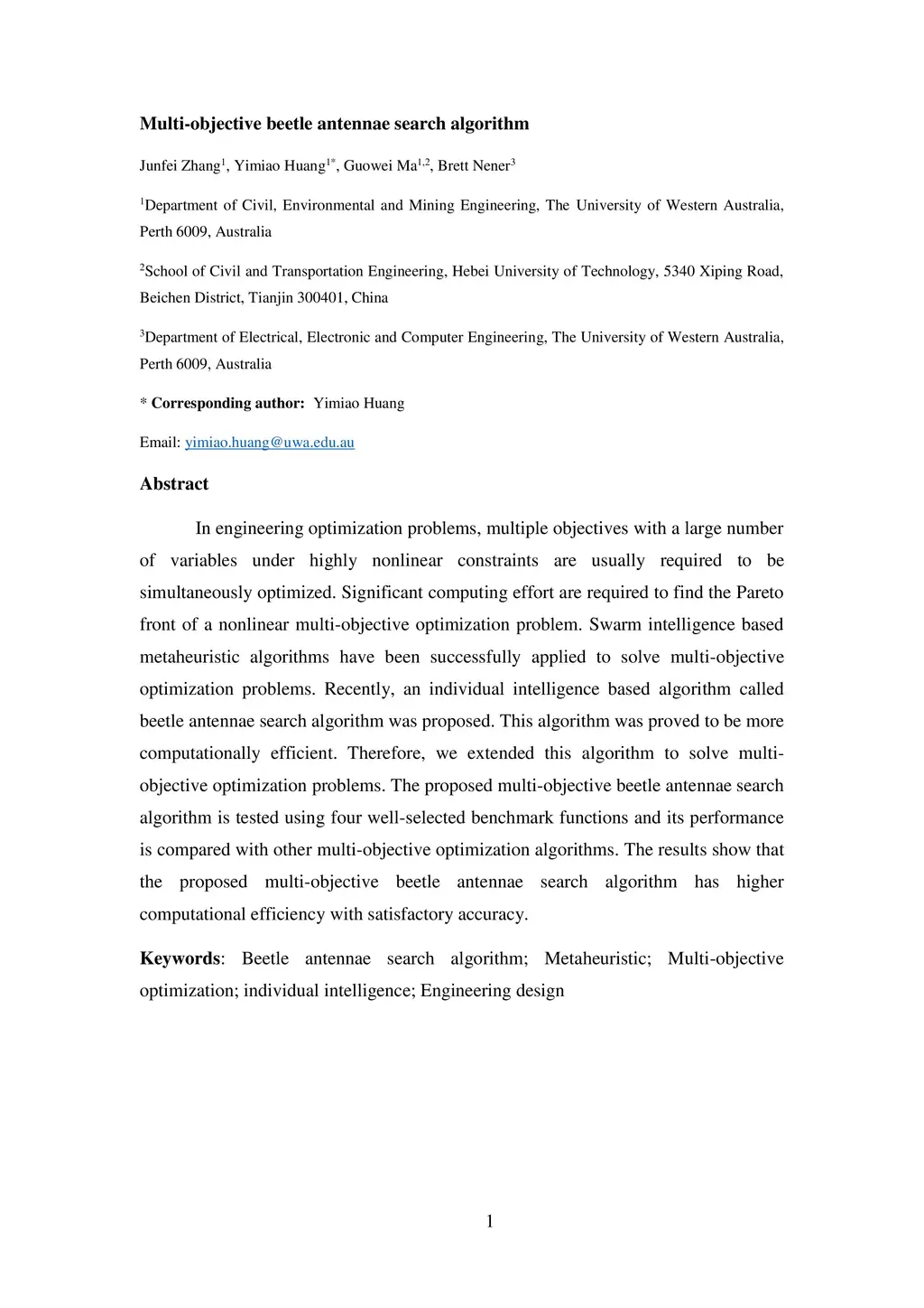 In engineering optimization problems, multiple objectives with a large number of variables under highly nonlinear constraints are usually required to be simultaneously optimized. Significant computing effort are required to find the Pareto front of a nonlinear multi-objective optimization problem. Swarm intelligence based metaheuristic algorithms have been successfully applied to solve multi-objective optimization problems. Recently, an individual intelligence based algorithm called beetle antennae search algorithm was proposed. This algorithm was proved to be more computationally efficient. Therefore, we extended this algorithm to solve multi-objective optimization problems. The proposed multi-objective beetle antennae search algorithm is tested using four well-selected benchmark functions and its performance is compared with other multi-objective optimization algorithms. The results show that the proposed multi-objective beetle antennae search algorithm has higher computational efficiency with satisfactory accuracy.