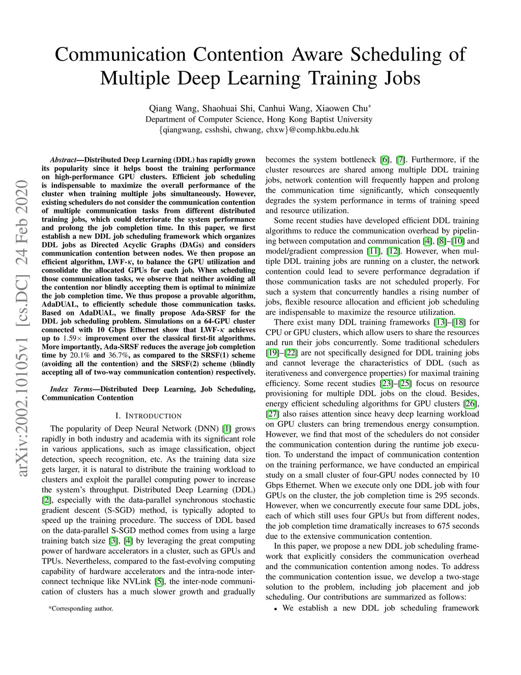 Distributed Deep Learning (DDL) has rapidly grown its popularity since it helps boost the training performance on high-performance GPU clusters. Efficient job scheduling is indispensable to maximize the overall performance of the cluster when training multiple jobs simultaneously. However, existing schedulers do not consider the communication contention of multiple communication tasks from different distributed training jobs, which could deteriorate the system performance and prolong the job completion time. In this paper, we first establish a new DDL job scheduling framework which organizes DDL jobs as Directed Acyclic Graphs (DAGs) and considers communication contention between nodes. We then propose an efficient algorithm, LWF-, to balance the GPU utilization and consolidate the allocated GPUs for each job. When scheduling those communication tasks, we observe that neither avoiding all the contention nor blindly accepting them is optimal to minimize the job completion time. We thus propose a provable algorithm, AdaDUAL, to efficiently schedule those communication tasks. Based on AdaDUAL, we finally propose Ada-SRSF for the DDL job scheduling problem. Simulations on a 64-GPU cluster connected with 10 Gbps Ethernet show that LWF- achieves up to improvement over the classical first-fit algorithms. More importantly, Ada-SRSF reduces the average job completion time by and , as compared to the SRSF(1) scheme (avoiding all the contention) and the SRSF(2) scheme (blindly accepting all of two-way communication contention) respectively.