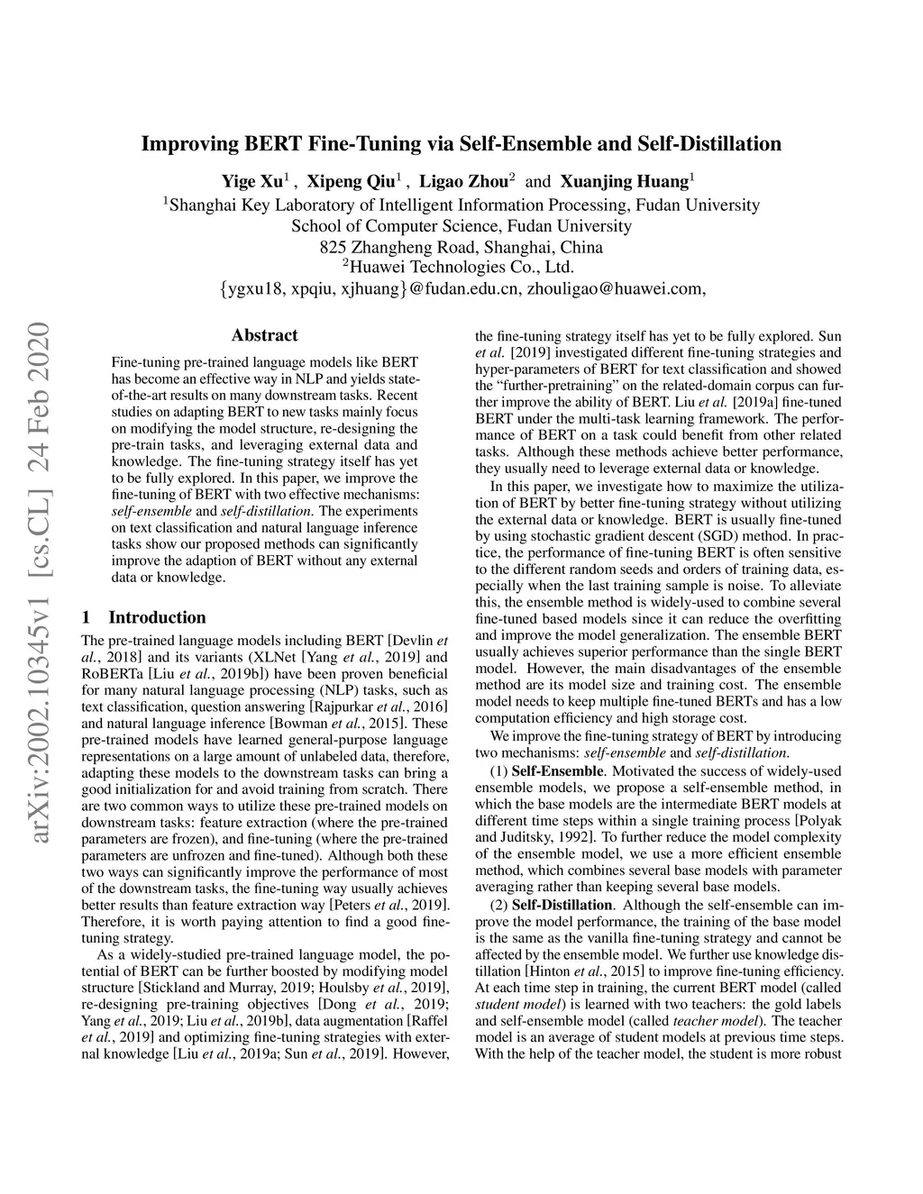 Fine-tuning pre-trained language models like BERT has become an effective way in NLP and yields state-of-the-art results on many downstream tasks. Recent studies on adapting BERT to new tasks mainly focus on modifying the model structure, re-designing the pre-train tasks, and leveraging external data and knowledge. The fine-tuning strategy itself has yet to be fully explored. In this paper, we improve the fine-tuning of BERT with two effective mechanisms: self-ensemble and self-distillation. The experiments on text classification and natural language inference tasks show our proposed methods can significantly improve the adaption of BERT without any external data or knowledge.