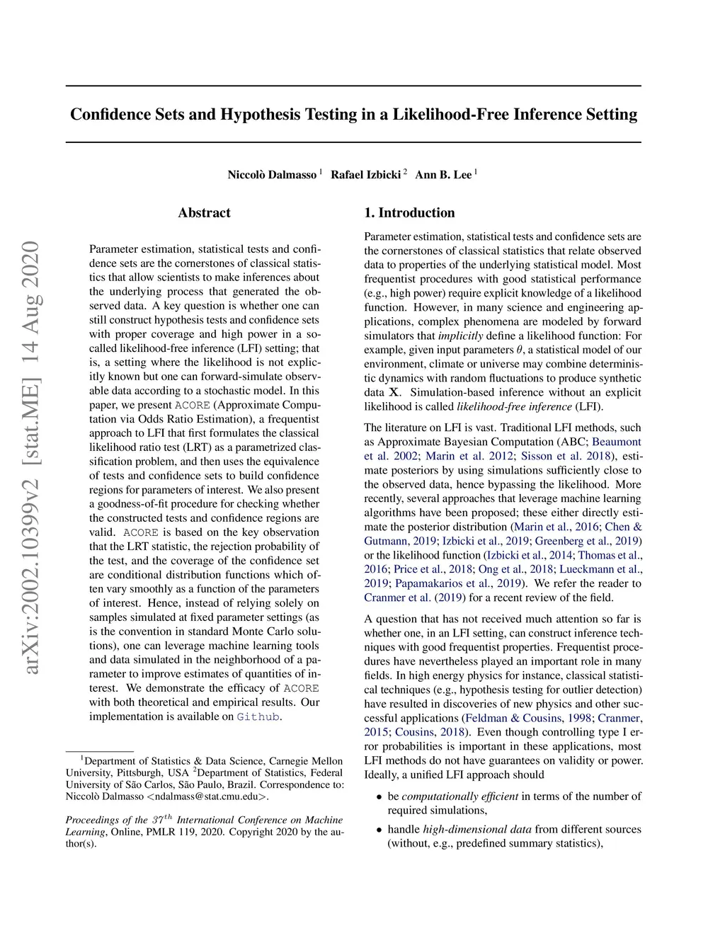 Parameter estimation, statistical tests and confidence sets are the cornerstones of classical statistics that allow scientists to make inferences about the underlying process that generated the observed data. A key question is whether one can still construct hypothesis tests and confidence sets with proper coverage and high power in a so-called likelihood-free inference (LFI) setting; that is, a setting where the likelihood is not explicitly known but one can forward-simulate observable data according to a stochastic model. In this paper, we present (Approximate Computation via Odds Ratio Estimation), a frequentist approach to LFI that first formulates the classical likelihood ratio test (LRT) as a parametrized classification problem, and then uses the equivalence of tests and confidence sets to build confidence regions for parameters of interest. We also present a goodness-of-fit procedure for checking whether the constructed tests and confidence regions are valid. is based on the key observation that the LRT statistic, the rejection probability of the test, and the coverage of the confidence set are conditional distribution functions which often vary smoothly as a function of the parameters of interest. Hence, instead of relying solely on samples simulated at fixed parameter settings (as is the convention in standard Monte Carlo solutions), one can leverage machine learning tools and data simulated in the neighborhood of a parameter to improve estimates of quantities of interest. We demonstrate the efficacy of with both theoretical and empirical results. Our implementation is available on Github.