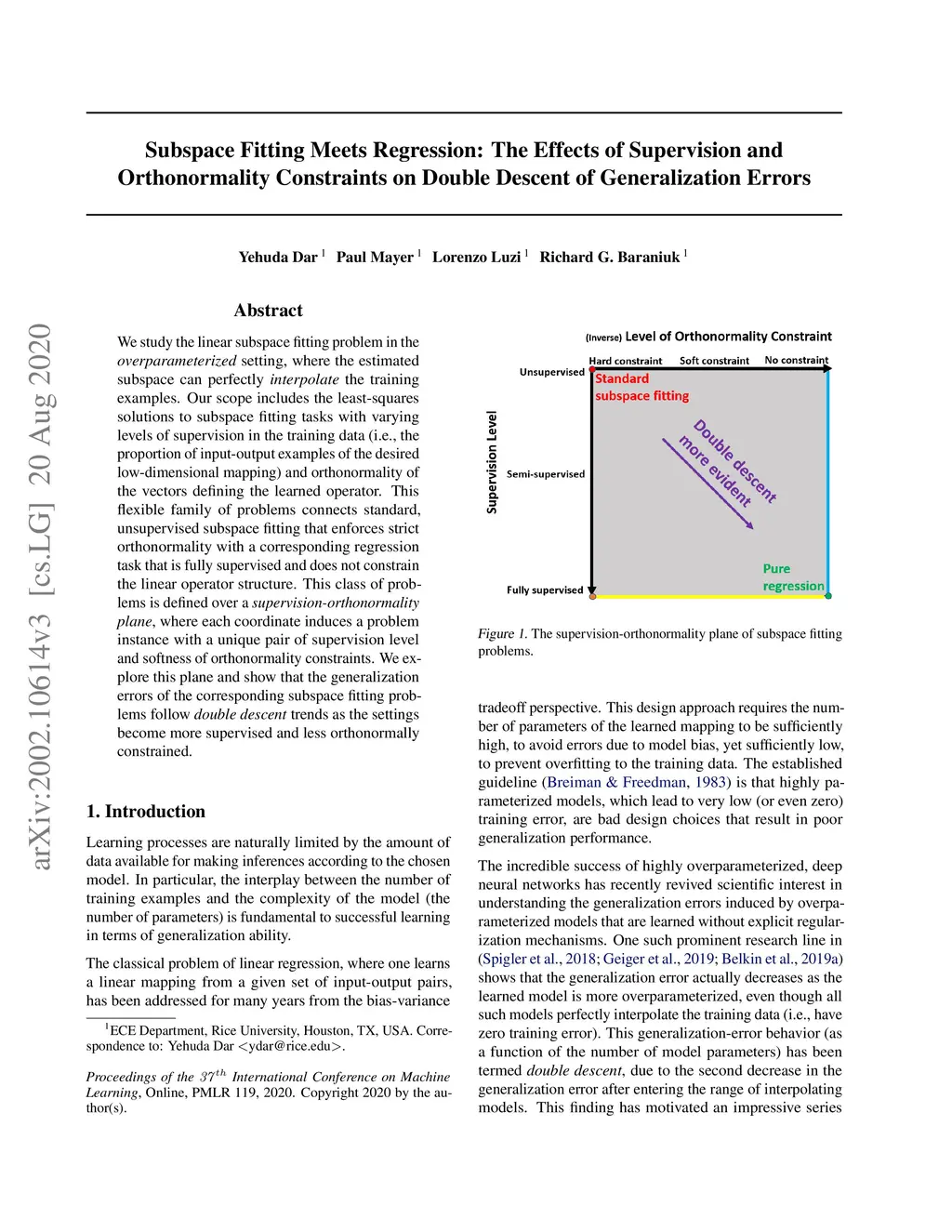 We study the linear subspace fitting problem in the overparameterized setting, where the estimated subspace can perfectly interpolate the training examples. Our scope includes the least-squares solutions to subspace fitting tasks with varying levels of supervision in the training data (i.e., the proportion of input-output examples of the desired low-dimensional mapping) and orthonormality of the vectors defining the learned operator. This flexible family of problems connects standard, unsupervised subspace fitting that enforces strict orthonormality with a corresponding regression task that is fully supervised and does not constrain the linear operator structure. This class of problems is defined over a supervision-orthonormality plane, where each coordinate induces a problem instance with a unique pair of supervision level and softness of orthonormality constraints. We explore this plane and show that the generalization errors of the corresponding subspace fitting problems follow double descent trends as the settings become more supervised and less orthonormally constrained.