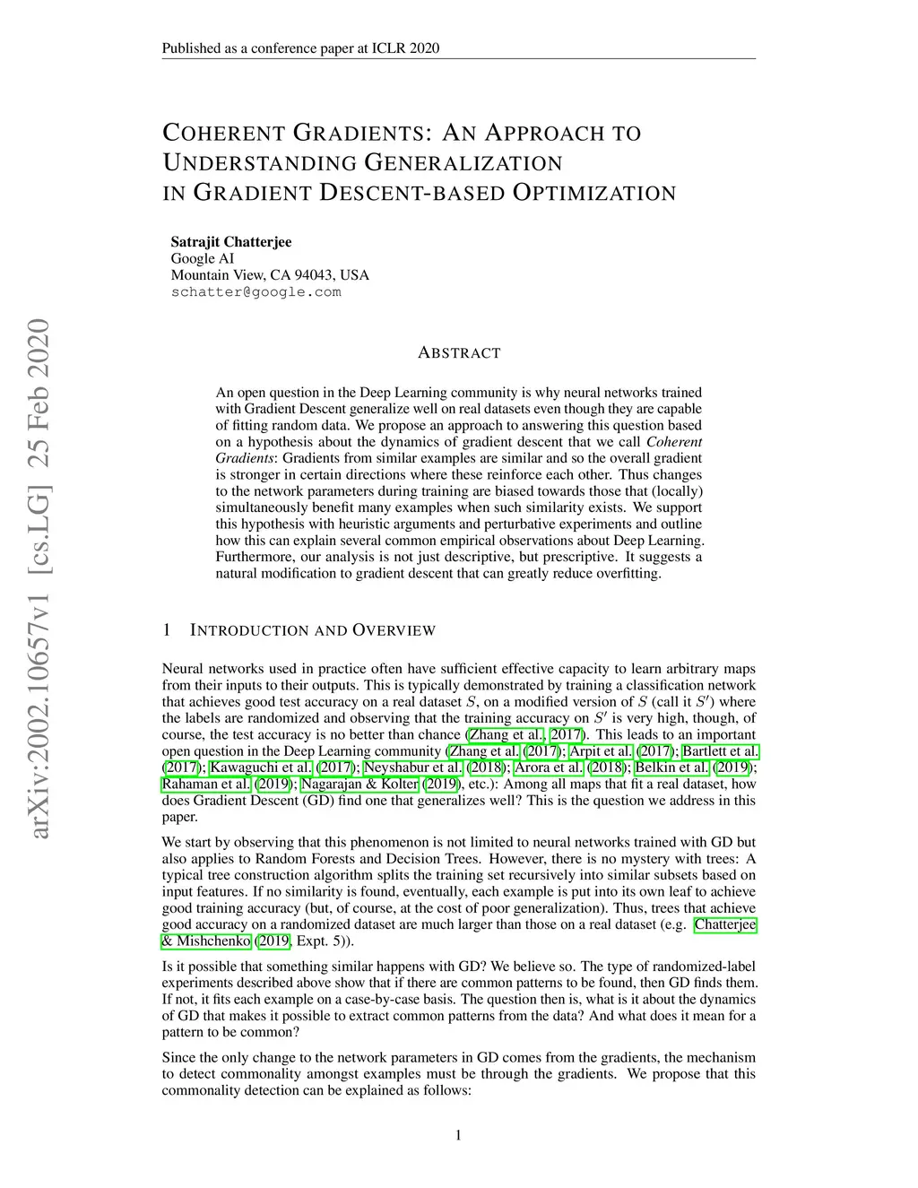 An open question in the Deep Learning community is why neural networks trained with Gradient Descent generalize well on real datasets even though they are capable of fitting random data. We propose an approach to answering this question based on a hypothesis about the dynamics of gradient descent that we call Coherent Gradients: Gradients from similar examples are similar and so the overall gradient is stronger in certain directions where these reinforce each other. Thus changes to the network parameters during training are biased towards those that (locally) simultaneously benefit many examples when such similarity exists. We support this hypothesis with heuristic arguments and perturbative experiments and outline how this can explain several common empirical observations about Deep Learning. Furthermore, our analysis is not just descriptive, but prescriptive. It suggests a natural modification to gradient descent that can greatly reduce overfitting.