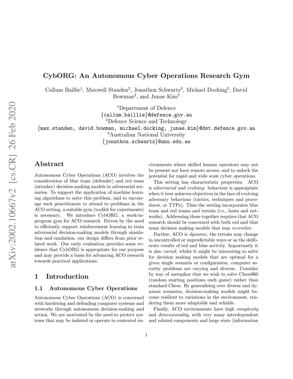 Autonomous Cyber Operations (ACO) involves the consideration of blue team (defender) and red team (attacker) decision-making models in adversarial scenarios. To support the application of machine learning algorithms to solve this problem, and to encourage such practitioners to attend to problems in the ACO setting, a suitable gym (toolkit for experiments) is necessary. We introduce CybORG, a work-in-progress gym for ACO research. Driven by the need to efficiently support reinforcement learning to train adversarial decision-making models through simulation and emulation, our design differs from prior related work. Our early evaluation provides some evidence that CybORG is appropriate for our purpose and may provide a basis for advancing ACO research towards practical applications.