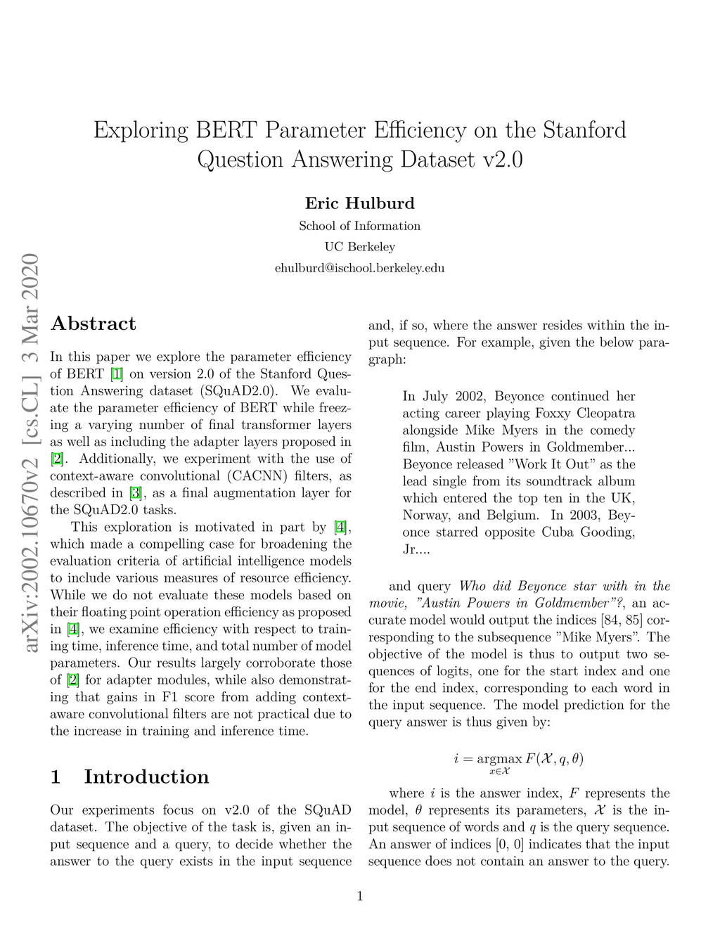 In this paper we explore the parameter efficiency of BERT arXiv:1810.04805 on version 2.0 of the Stanford Question Answering dataset (SQuAD2.0). We evaluate the parameter efficiency of BERT while freezing a varying number of final transformer layers as well as including the adapter layers proposed in arXiv:1902.00751. Additionally, we experiment with the use of context-aware convolutional (CACNN) filters, as described in arXiv:1709.08294v3, as a final augmentation layer for the SQuAD2.0 tasks. This exploration is motivated in part by arXiv:1907.10597, which made a compelling case for broadening the evaluation criteria of artificial intelligence models to include various measures of resource efficiency. While we do not evaluate these models based on their floating point operation efficiency as proposed in arXiv:1907.10597, we examine efficiency with respect to training time, inference time, and total number of model parameters. Our results largely corroborate those of arXiv:1902.00751 for adapter modules, while also demonstrating that gains in F1 score from adding context-aware convolutional filters are not practical due to the increase in training and inference time.