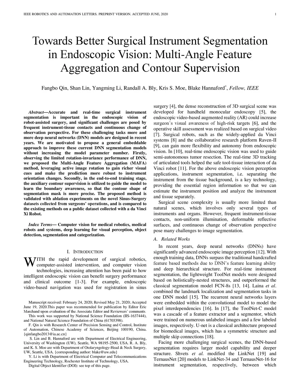 Accurate and real-time surgical instrument segmentation is important in the endoscopic vision of robot-assisted surgery, and significant challenges are posed by frequent instrument-tissue contacts and continuous change of observation perspective. For these challenging tasks more and more deep neural networks (DNN) models are designed in recent years. We are motivated to propose a general embeddable approach to improve these current DNN segmentation models without increasing the model parameter number. Firstly, observing the limited rotation-invariance performance of DNN, we proposed the Multi-Angle Feature Aggregation (MAFA) method, leveraging active image rotation to gain richer visual cues and make the prediction more robust to instrument orientation changes. Secondly, in the end-to-end training stage, the auxiliary contour supervision is utilized to guide the model to learn the boundary awareness, so that the contour shape of segmentation mask is more precise. The proposed method is validated with ablation experiments on the novel Sinus-Surgery datasets collected from surgeons' operations, and is compared to the existing methods on a public dataset collected with a da Vinci Xi Robot.