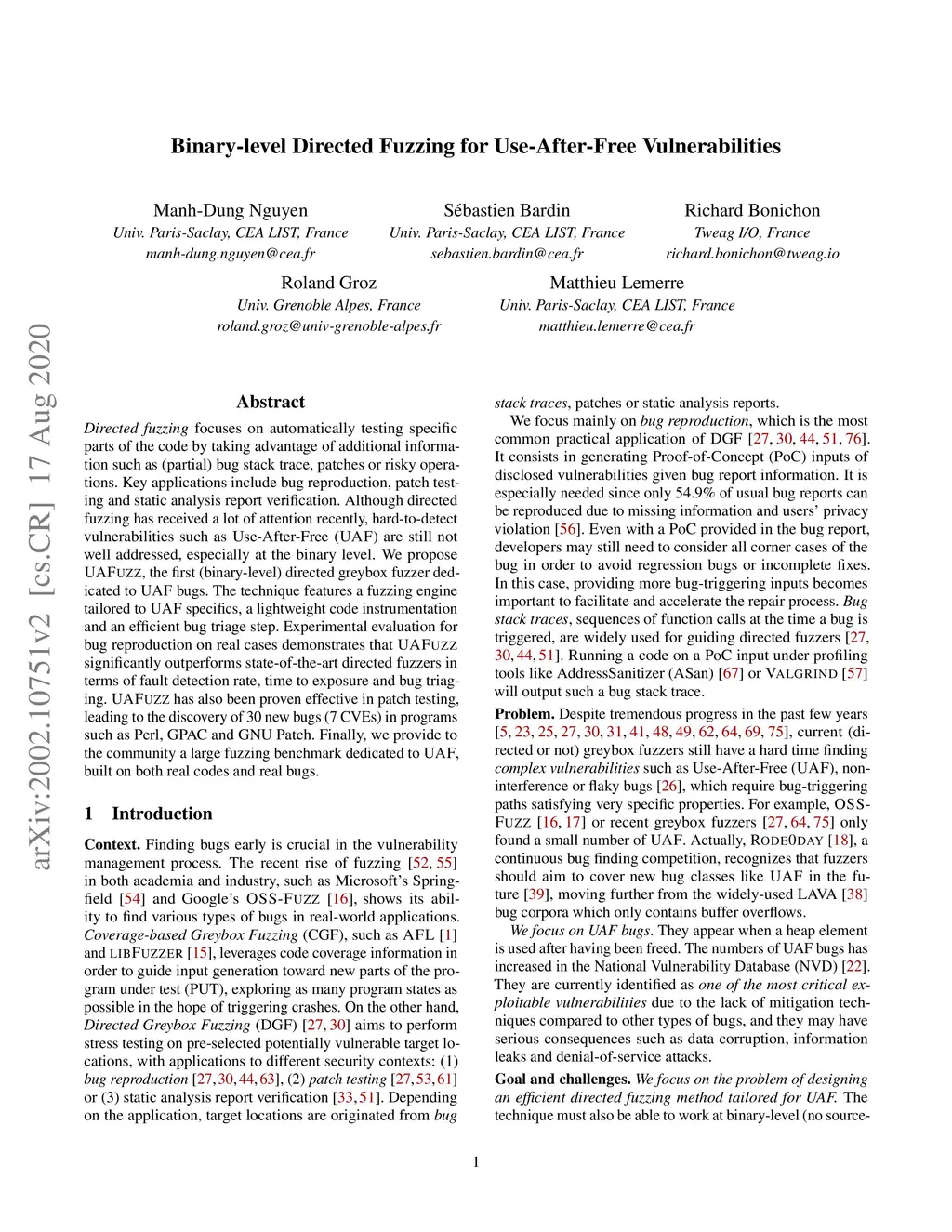 Directed fuzzing focuses on automatically testing specific parts of the code by taking advantage of additional information such as (partial) bug stack trace, patches or risky operations. Key applications include bug reproduction, patch testing and static analysis report verification. Although directed fuzzing has received a lot of attention recently, hard-to-detect vulnerabilities such as Use-After-Free (UAF) are still not well addressed, especially at the binary level. We propose UAFuzz, the first (binary-level) directed greybox fuzzer dedicated to UAF bugs. The technique features a fuzzing engine tailored to UAF specifics, a lightweight code instrumentation and an efficient bug triage step. Experimental evaluation for bug reproduction on real cases demonstrates that UAFuzz significantly outperforms state-of-the-art directed fuzzers in terms of fault detection rate, time to exposure and bug triaging. UAFuzz has also been proven effective in patch testing, leading to the discovery of 30 new bugs (7 CVEs) in programs such as Perl, GPAC and GNU Patch. Finally, we provide to the community a large fuzzing benchmark dedicated to UAF, built on both real codes and real bugs.