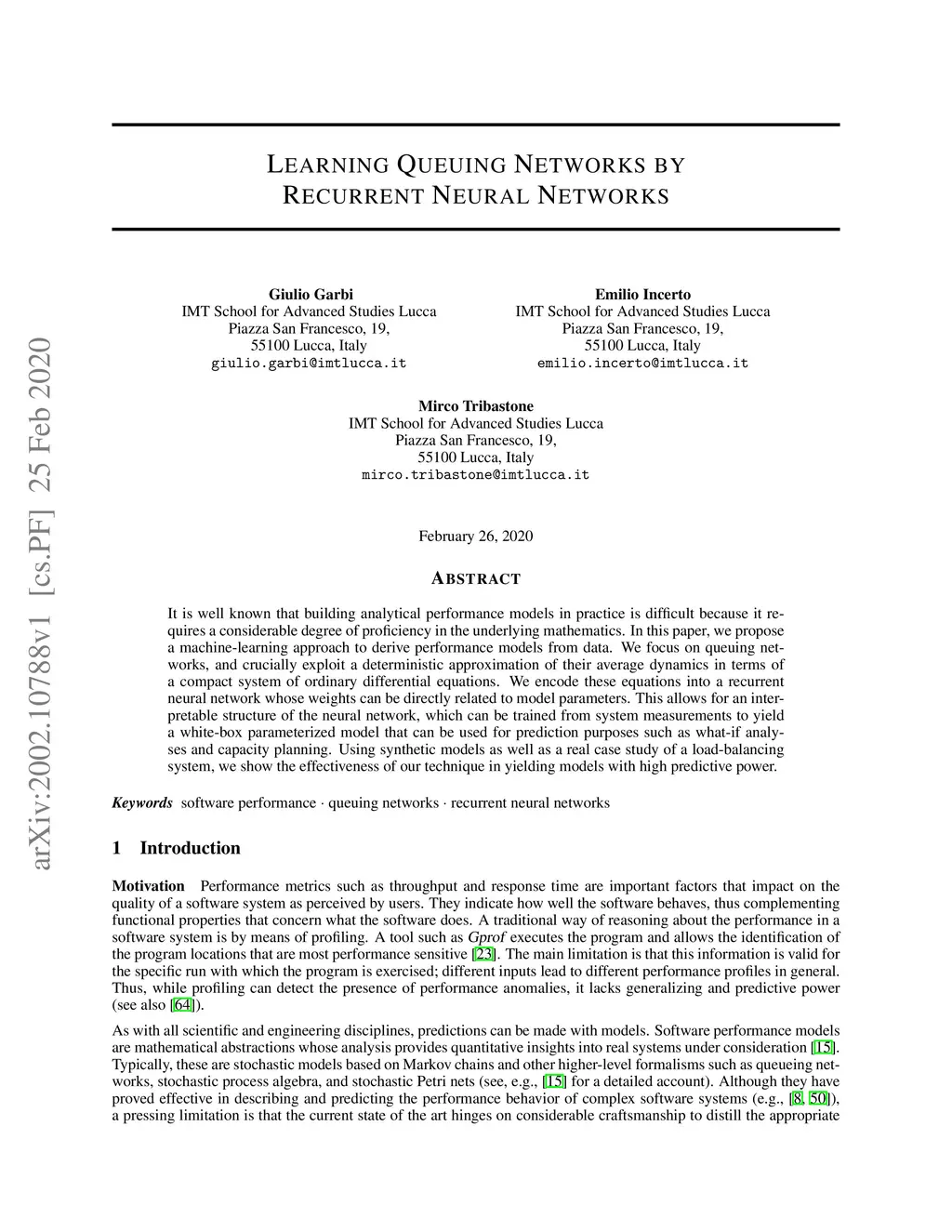 It is well known that building analytical performance models in practice is difficult because it requires a considerable degree of proficiency in the underlying mathematics. In this paper, we propose a machine-learning approach to derive performance models from data. We focus on queuing networks, and crucially exploit a deterministic approximation of their average dynamics in terms of a compact system of ordinary differential equations. We encode these equations into a recurrent neural network whose weights can be directly related to model parameters. This allows for an interpretable structure of the neural network, which can be trained from system measurements to yield a white-box parameterized model that can be used for prediction purposes such as what-if analyses and capacity planning. Using synthetic models as well as a real case study of a load-balancing system, we show the effectiveness of our technique in yielding models with high predictive power.