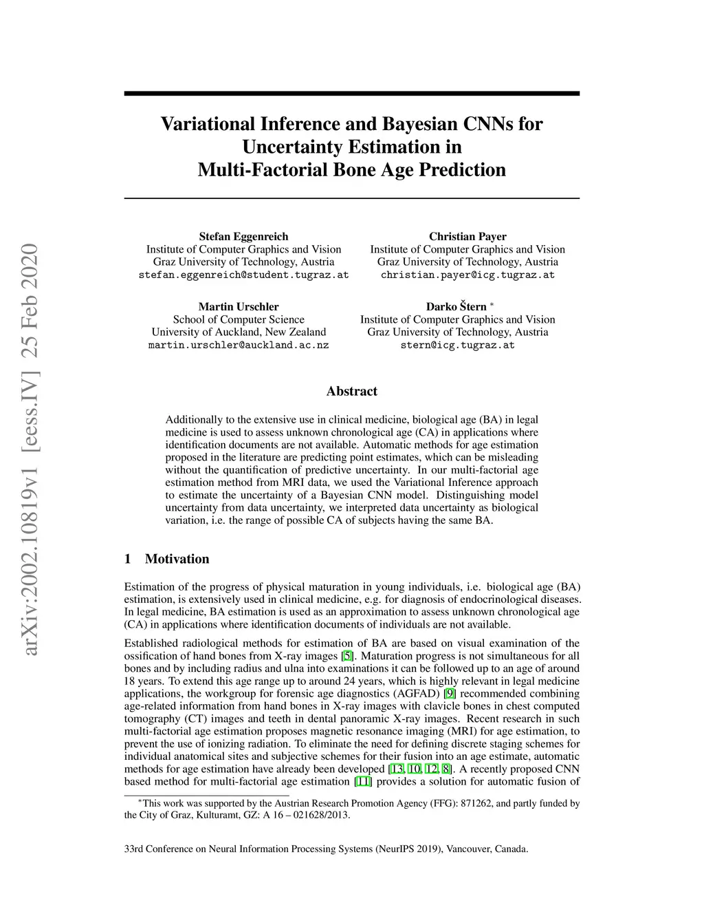Additionally to the extensive use in clinical medicine, biological age (BA) in legal medicine is used to assess unknown chronological age (CA) in applications where identification documents are not available. Automatic methods for age estimation proposed in the literature are predicting point estimates, which can be misleading without the quantification of predictive uncertainty. In our multi-factorial age estimation method from MRI data, we used the Variational Inference approach to estimate the uncertainty of a Bayesian CNN model. Distinguishing model uncertainty from data uncertainty, we interpreted data uncertainty as biological variation, i.e. the range of possible CA of subjects having the same BA.