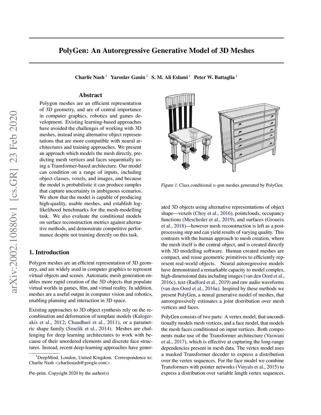 PolyGen: An Autoregressive Generative Model of 3D Meshes