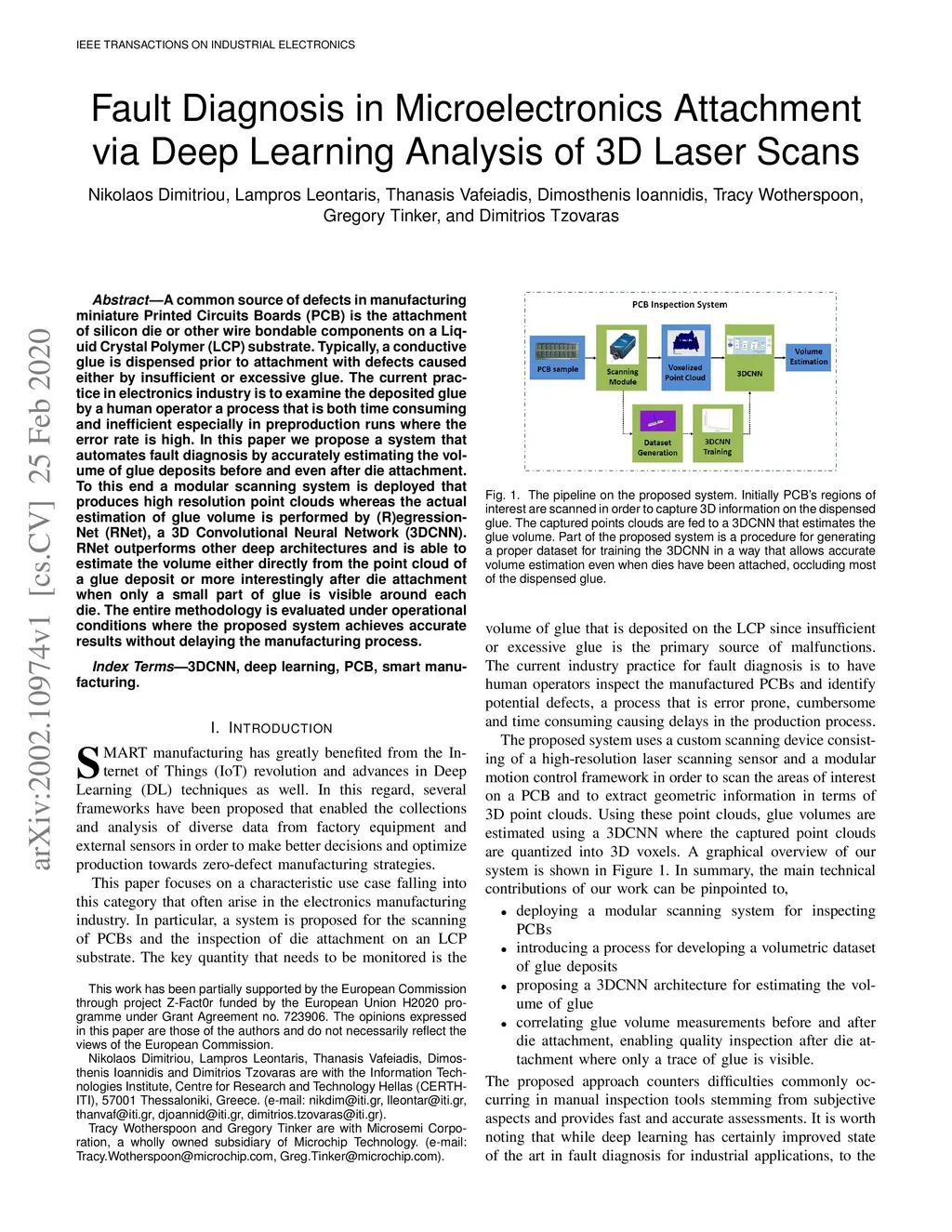 A common source of defects in manufacturing miniature Printed Circuits Boards (PCB) is the attachment of silicon die or other wire bondable components on a Liquid Crystal Polymer (LCP) substrate. Typically, a conductive glue is dispensed prior to attachment with defects caused either by insufficient or excessive glue. The current practice in electronics industry is to examine the deposited glue by a human operator a process that is both time consuming and inefficient especially in preproduction runs where the error rate is high. In this paper we propose a system that automates fault diagnosis by accurately estimating the volume of glue deposits before and even after die attachment. To this end a modular scanning system is deployed that produces high resolution point clouds whereas the actual estimation of glue volume is performed by (R)egression-Net (RNet), a 3D Convolutional Neural Network (3DCNN). RNet outperforms other deep architectures and is able to estimate the volume either directly from the point cloud of a glue deposit or more interestingly after die attachment when only a small part of glue is visible around each die. The entire methodology is evaluated under operational conditions where the proposed system achieves accurate results without delaying the manufacturing process.