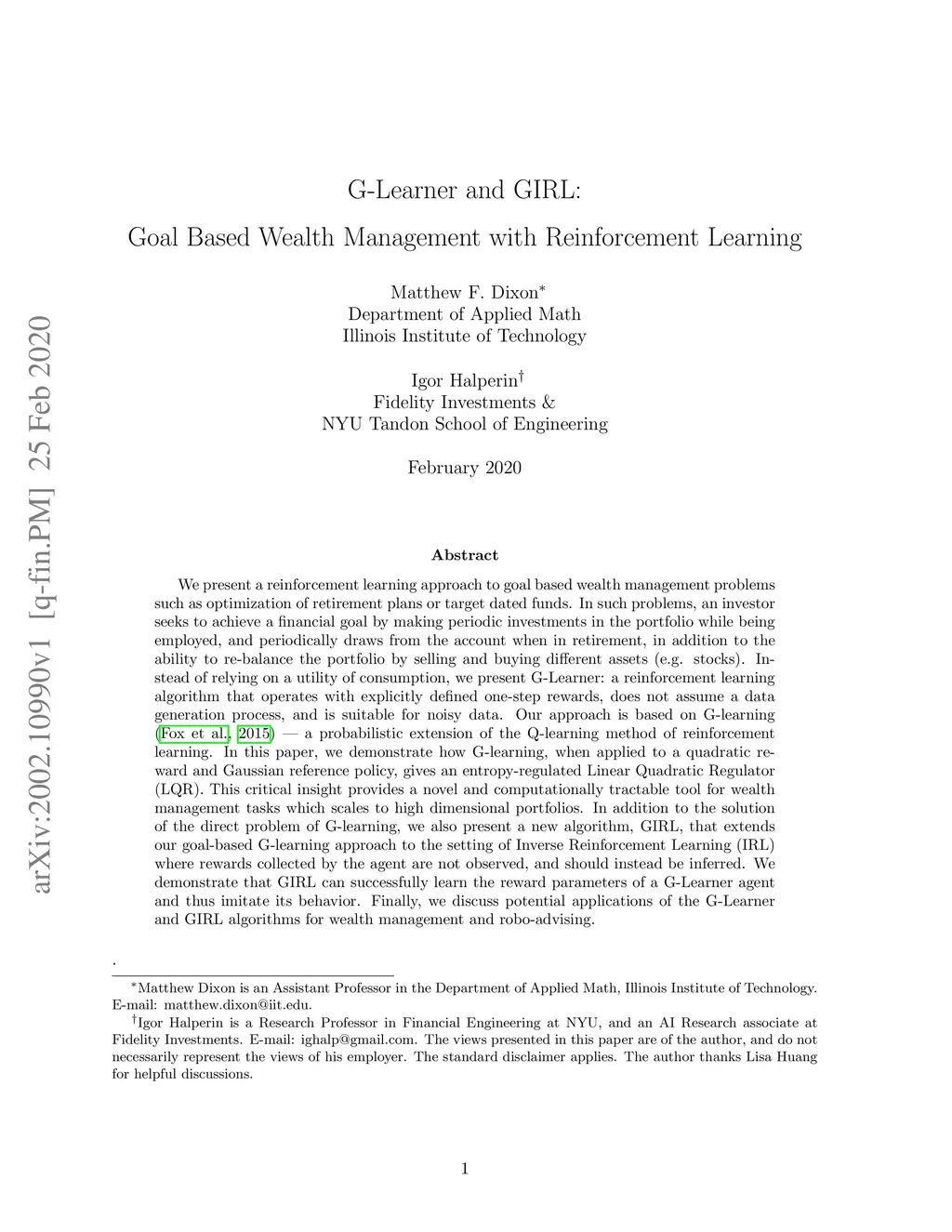 We present a reinforcement learning approach to goal based wealth management problems such as optimization of retirement plans or target dated funds. In such problems, an investor seeks to achieve a financial goal by making periodic investments in the portfolio while being employed, and periodically draws from the account when in retirement, in addition to the ability to re-balance the portfolio by selling and buying different assets (e.g. stocks). Instead of relying on a utility of consumption, we present G-Learner: a reinforcement learning algorithm that operates with explicitly defined one-step rewards, does not assume a data generation process, and is suitable for noisy data. Our approach is based on G-learning - a probabilistic extension of the Q-learning method of reinforcement learning. In this paper, we demonstrate how G-learning, when applied to a quadratic reward and Gaussian reference policy, gives an entropy-regulated Linear Quadratic Regulator (LQR). This critical insight provides a novel and computationally tractable tool for wealth management tasks which scales to high dimensional portfolios. In addition to the solution of the direct problem of G-learning, we also present a new algorithm, GIRL, that extends our goal-based G-learning approach to the setting of Inverse Reinforcement Learning (IRL) where rewards collected by the agent are not observed, and should instead be inferred. We demonstrate that GIRL can successfully learn the reward parameters of a G-Learner agent and thus imitate its behavior. Finally, we discuss potential applications of the G-Learner and GIRL algorithms for wealth management and robo-advising.