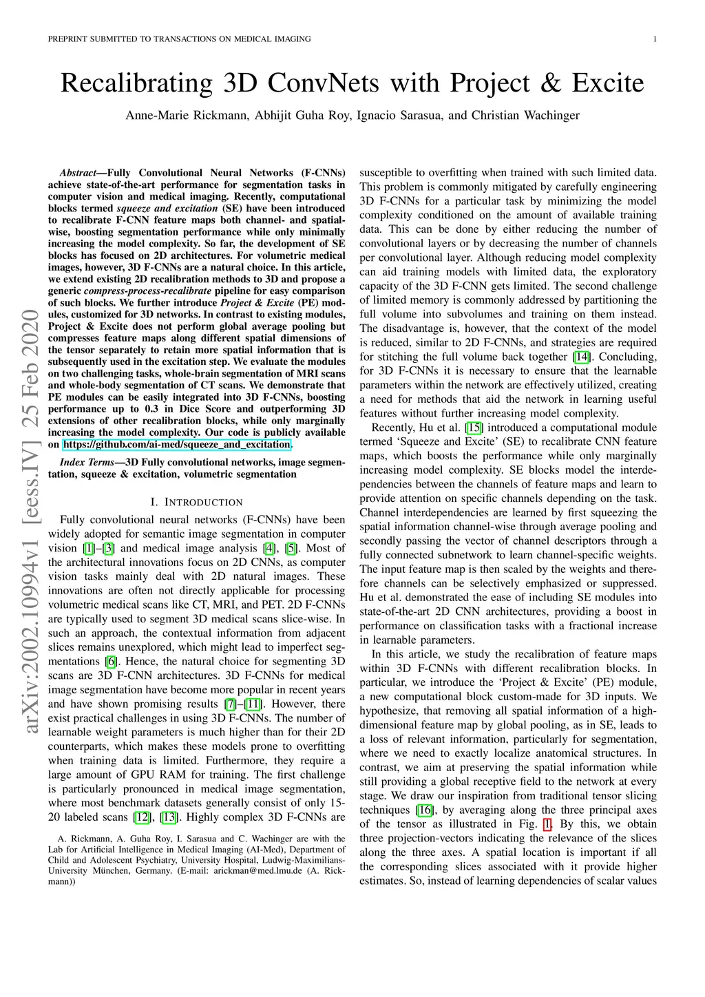 Fully Convolutional Neural Networks (F-CNNs) achieve state-of-the-art performance for segmentation tasks in computer vision and medical imaging. Recently, computational blocks termed squeeze and excitation (SE) have been introduced to recalibrate F-CNN feature maps both channel- and spatial-wise, boosting segmentation performance while only minimally increasing the model complexity. So far, the development of SE blocks has focused on 2D architectures. For volumetric medical images, however, 3D F-CNNs are a natural choice. In this article, we extend existing 2D recalibration methods to 3D and propose a generic compress-process-recalibrate pipeline for easy comparison of such blocks. We further introduce Project & Excite (PE) modules, customized for 3D networks. In contrast to existing modules, Project \& Excite does not perform global average pooling but compresses feature maps along different spatial dimensions of the tensor separately to retain more spatial information that is subsequently used in the excitation step. We evaluate the modules on two challenging tasks, whole-brain segmentation of MRI scans and whole-body segmentation of CT scans. We demonstrate that PE modules can be easily integrated into 3D F-CNNs, boosting performance up to 0.3 in Dice Score and outperforming 3D extensions of other recalibration blocks, while only marginally increasing the model complexity. Our code is publicly available on https://github.com/ai-med/squeeze_and_excitation .