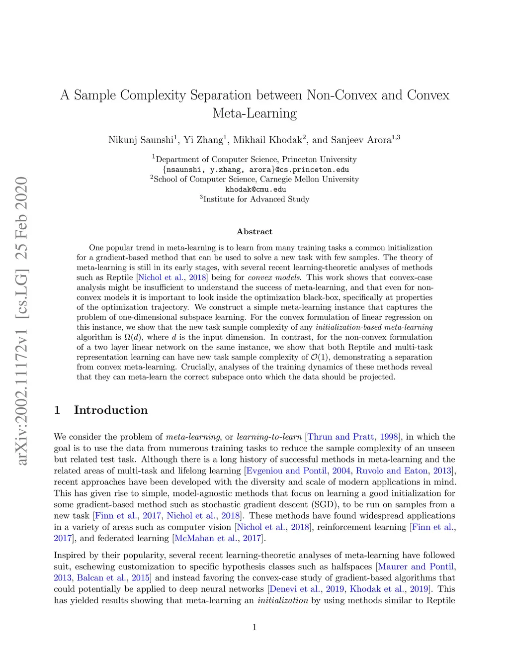 One popular trend in meta-learning is to learn from many training tasks a common initialization for a gradient-based method that can be used to solve a new task with few samples. The theory of meta-learning is still in its early stages, with several recent learning-theoretic analyses of methods such as Reptile [Nichol et al., 2018] being for convex models. This work shows that convex-case analysis might be insufficient to understand the success of meta-learning, and that even for non-convex models it is important to look inside the optimization black-box, specifically at properties of the optimization trajectory. We construct a simple meta-learning instance that captures the problem of one-dimensional subspace learning. For the convex formulation of linear regression on this instance, we show that the new task sample complexity of any initialization-based meta-learning algorithm is , where is the input dimension. In contrast, for the non-convex formulation of a two layer linear network on the same instance, we show that both Reptile and multi-task representation learning can have new task sample complexity of , demonstrating a separation from convex meta-learning. Crucially, analyses of the training dynamics of these methods reveal that they can meta-learn the correct subspace onto which the data should be projected.