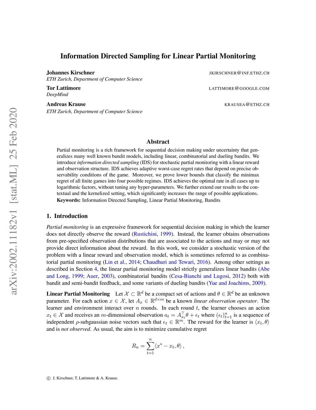 Partial monitoring is a rich framework for sequential decision making under uncertainty that generalizes many well known bandit models, including linear, combinatorial and dueling bandits. We introduce information directed sampling (IDS) for stochastic partial monitoring with a linear reward and observation structure. IDS achieves adaptive worst-case regret rates that depend on precise observability conditions of the game. Moreover, we prove lower bounds that classify the minimax regret of all finite games into four possible regimes. IDS achieves the optimal rate in all cases up to logarithmic factors, without tuning any hyper-parameters. We further extend our results to the contextual and the kernelized setting, which significantly increases the range of possible applications.