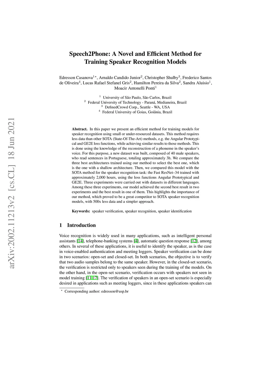 In this paper we present an efficient method for training models for speaker recognition using small or under-resourced datasets. This method requires less data than other SOTA (State-Of-The-Art) methods, e.g. the Angular Prototypical and GE2E loss functions, while achieving similar results to those methods. This is done using the knowledge of the reconstruction of a phoneme in the speaker's voice. For this purpose, a new dataset was built, composed of 40 male speakers, who read sentences in Portuguese, totaling approximately 3h. We compare the three best architectures trained using our method to select the best one, which is the one with a shallow architecture. Then, we compared this model with the SOTA method for the speaker recognition task: the Fast ResNet-34 trained with approximately 2,000 hours, using the loss functions Angular Prototypical and GE2E. Three experiments were carried out with datasets in different languages. Among these three experiments, our model achieved the second best result in two experiments and the best result in one of them. This highlights the importance of our method, which proved to be a great competitor to SOTA speaker recognition models, with 500x less data and a simpler approach.