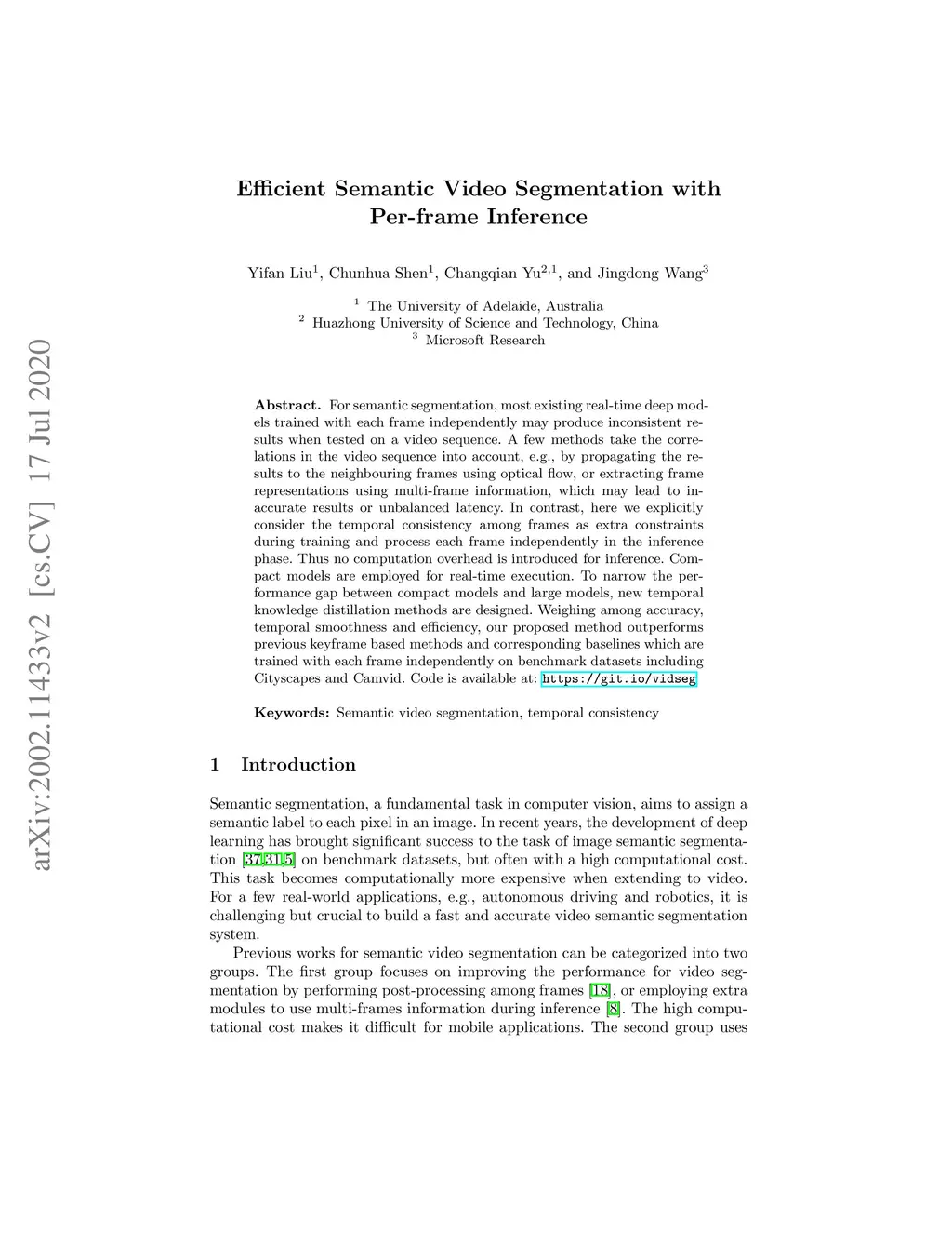 For semantic segmentation, most existing real-time deep models trained with each frame independently may produce inconsistent results for a video sequence. Advanced methods take into considerations the correlations in the video sequence, e.g., by propagating the results to the neighboring frames using optical flow, or extracting the frame representations with other frames, which may lead to inaccurate results or unbalanced latency. In this work, we process efficient semantic video segmentation in a per-frame fashion during the inference process. Different from previous per-frame models, we explicitly consider the temporal consistency among frames as extra constraints during the training process and embed the temporal consistency into the segmentation network. Therefore, in the inference process, we can process each frame independently with no latency, and improve the temporal consistency with no extra computational cost and post-processing. We employ compact models for real-time execution. To narrow the performance gap between compact models and large models, new knowledge distillation methods are designed. Our results outperform previous keyframe based methods with a better trade-off between the accuracy and the inference speed on popular benchmarks, including the Cityscapes and Camvid. The temporal consistency is also improved compared with corresponding baselines which are trained with each frame independently. Code is available at: https://tinyurl.com/segment-video