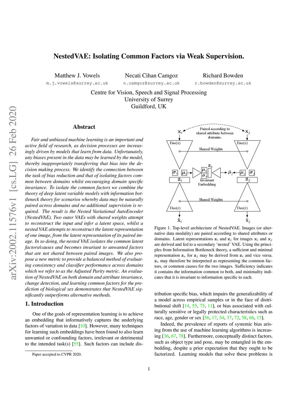 Fair and unbiased machine learning is an important and active field of research, as decision processes are increasingly driven by models that learn from data. Unfortunately, any biases present in the data may be learned by the model, thereby inappropriately transferring that bias into the decision making process. We identify the connection between the task of bias reduction and that of isolating factors common between domains whilst encouraging domain specific invariance. To isolate the common factors we combine the theory of deep latent variable models with information bottleneck theory for scenarios whereby data may be naturally paired across domains and no additional supervision is required. The result is the Nested Variational AutoEncoder (NestedVAE). Two outer VAEs with shared weights attempt to reconstruct the input and infer a latent space, whilst a nested VAE attempts to reconstruct the latent representation of one image, from the latent representation of its paired image. In so doing, the nested VAE isolates the common latent factors/causes and becomes invariant to unwanted factors that are not shared between paired images. We also propose a new metric to provide a balanced method of evaluating consistency and classifier performance across domains which we refer to as the Adjusted Parity metric. An evaluation of NestedVAE on both domain and attribute invariance, change detection, and learning common factors for the prediction of biological sex demonstrates that NestedVAE significantly outperforms alternative methods.