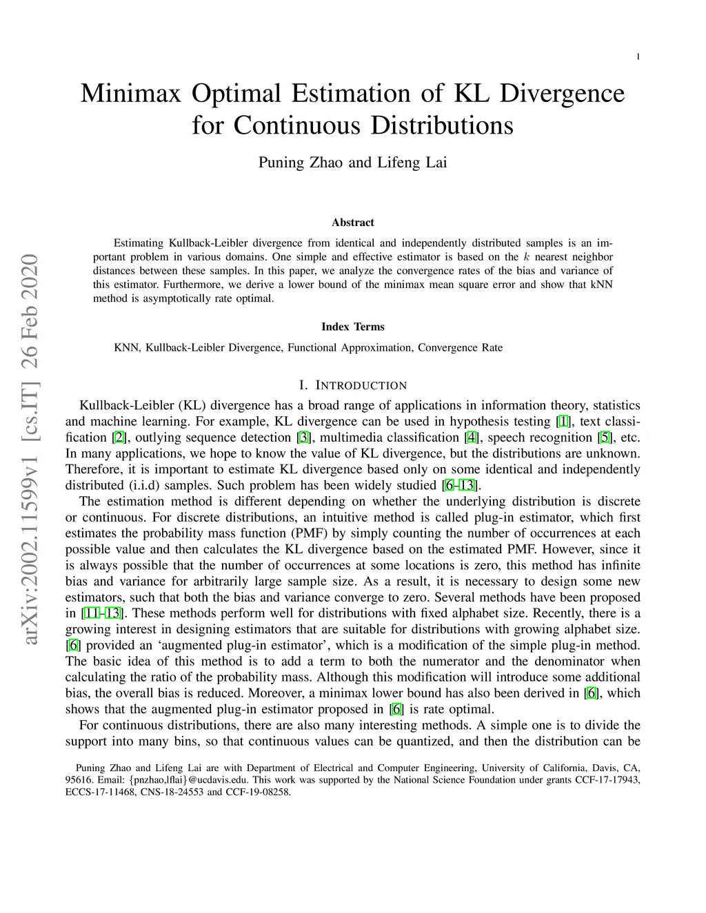 Estimating Kullback-Leibler divergence from identical and independently distributed samples is an important problem in various domains. One simple and effective estimator is based on the k nearest neighbor distances between these samples. In this paper, we analyze the convergence rates of the bias and variance of this estimator. Furthermore, we derive a lower bound of the minimax mean square error and show that kNN method is asymptotically rate optimal.