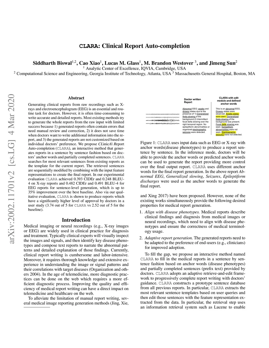 Generating clinical reports from raw recordings such as X-rays and electroencephalogram (EEG) is an essential and routine task for doctors. However, it is often time-consuming to write accurate and detailed reports. Most existing methods try to generate the whole reports from the raw input with limited success because 1) generated reports often contain errors that need manual review and correction, 2) it does not save time when doctors want to write additional information into the report, and 3) the generated reports are not customized based on individual doctors' preference. We propose {\it CL}inic{\it A}l {\it R}eport {\it A}uto-completion (CLARA), an interactive method that generates reports in a sentence by sentence fashion based on doctors' anchor words and partially completed sentences. CLARA searches for most relevant sentences from existing reports as the template for the current report. The retrieved sentences are sequentially modified by combining with the input feature representations to create the final report. In our experimental evaluation, CLARA achieved 0.393 CIDEr and 0.248 BLEU-4 on X-ray reports and 0.482 CIDEr and 0.491 BLEU-4 for EEG reports for sentence-level generation, which is up to 35% improvement over the best baseline. Also via our qualitative evaluation, CLARA is shown to produce reports which have a significantly higher level of approval by doctors in a user study (3.74 out of 5 for CLARA vs 2.52 out of 5 for the baseline).
