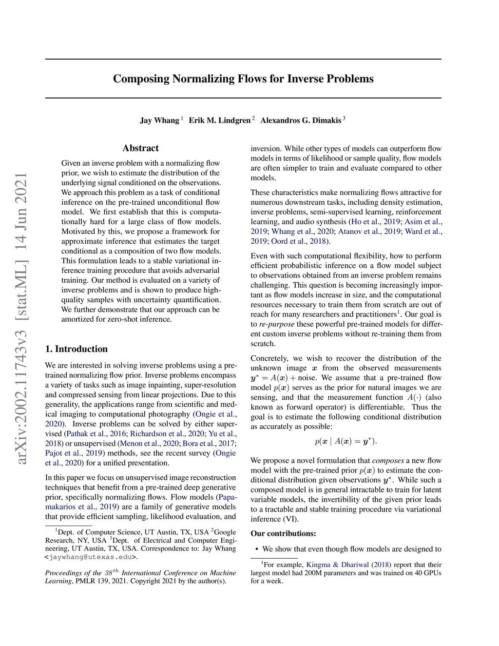 Given an inverse problem with a normalizing flow prior, we wish to estimate the distribution of the underlying signal conditioned on the observations. We approach this problem as a task of conditional inference on the pre-trained unconditional flow model. We first establish that this is computationally hard for a large class of flow models. Motivated by this, we propose a framework for approximate inference that estimates the target conditional as a composition of two flow models. This formulation leads to a stable variational inference training procedure that avoids adversarial training. Our method is evaluated on a variety of inverse problems and is shown to produce high-quality samples with uncertainty quantification. We further demonstrate that our approach can be amortized for zero-shot inference.