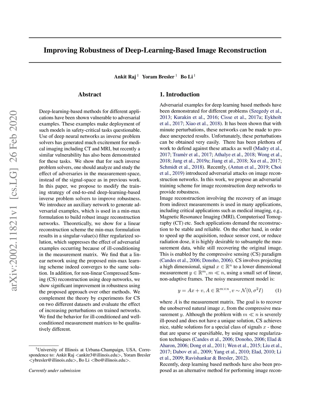 Deep-learning-based methods for different applications have been shown vulnerable to adversarial examples. These examples make deployment of such models in safety-critical tasks questionable. Use of deep neural networks as inverse problem solvers has generated much excitement for medical imaging including CT and MRI, but recently a similar vulnerability has also been demonstrated for these tasks. We show that for such inverse problem solvers, one should analyze and study the effect of adversaries in the measurement-space, instead of the signal-space as in previous work. In this paper, we propose to modify the training strategy of end-to-end deep-learning-based inverse problem solvers to improve robustness. We introduce an auxiliary network to generate adversarial examples, which is used in a min-max formulation to build robust image reconstruction networks. Theoretically, we show for a linear reconstruction scheme the min-max formulation results in a singular-value(s) filter regularized solution, which suppresses the effect of adversarial examples occurring because of ill-conditioning in the measurement matrix. We find that a linear network using the proposed min-max learning scheme indeed converges to the same solution. In addition, for non-linear Compressed Sensing (CS) reconstruction using deep networks, we show significant improvement in robustness using the proposed approach over other methods. We complement the theory by experiments for CS on two different datasets and evaluate the effect of increasing perturbations on trained networks. We find the behavior for ill-conditioned and well-conditioned measurement matrices to be qualitatively different.