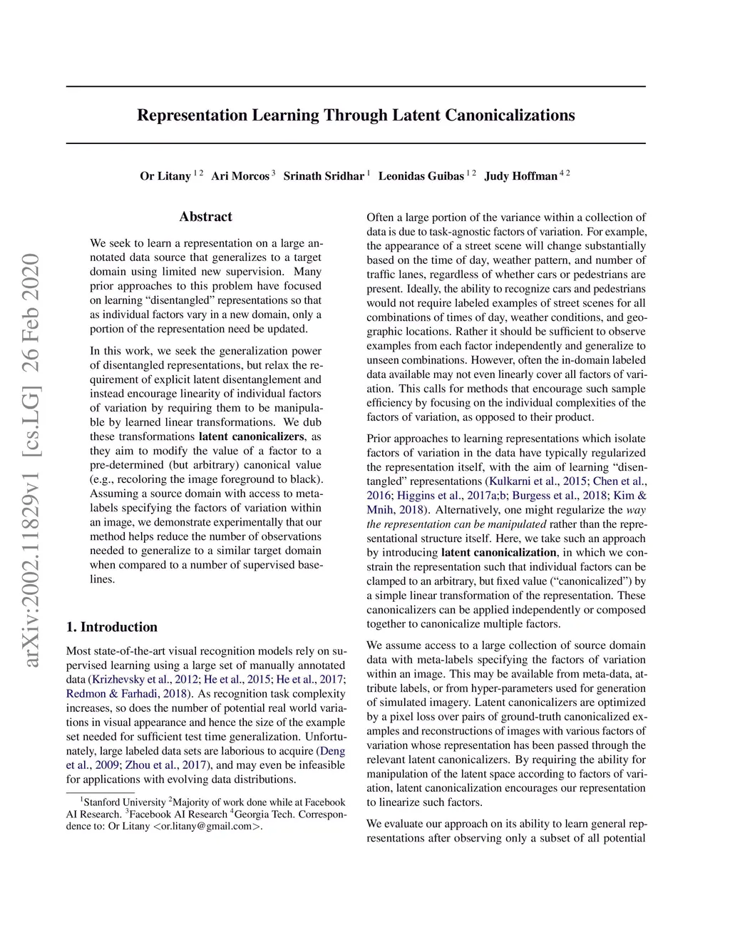 We seek to learn a representation on a large annotated data source that generalizes to a target domain using limited new supervision. Many prior approaches to this problem have focused on learning "disentangled" representations so that as individual factors vary in a new domain, only a portion of the representation need be updated. In this work, we seek the generalization power of disentangled representations, but relax the requirement of explicit latent disentanglement and instead encourage linearity of individual factors of variation by requiring them to be manipulable by learned linear transformations. We dub these transformations latent canonicalizers, as they aim to modify the value of a factor to a pre-determined (but arbitrary) canonical value (e.g., recoloring the image foreground to black). Assuming a source domain with access to meta-labels specifying the factors of variation within an image, we demonstrate experimentally that our method helps reduce the number of observations needed to generalize to a similar target domain when compared to a number of supervised baselines.