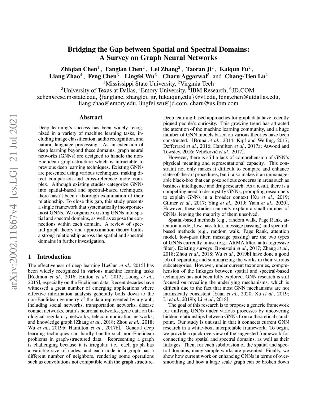 Deep learning's success has been widely recognized in a variety of machine learning tasks, including image classification, audio recognition, and natural language processing. As an extension of deep learning beyond these domains, graph neural networks (GNNs) are designed to handle the non-Euclidean graph-structure which is intractable to previous deep learning techniques. Existing GNNs are presented using various techniques, making direct comparison and cross-reference more complex. Although existing studies categorize GNNs into spatial-based and spectral-based techniques, there hasn't been a thorough examination of their relationship. To close this gap, this study presents a single framework that systematically incorporates most GNNs. We organize existing GNNs into spatial and spectral domains, as well as expose the connections within each domain. A review of spectral graph theory and approximation theory builds a strong relationship across the spatial and spectral domains in further investigation.