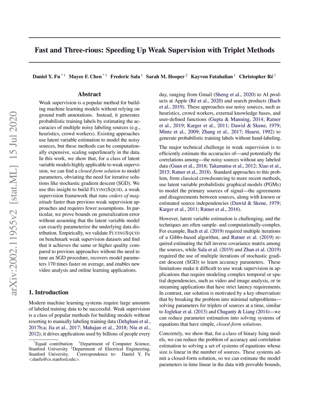 Weak supervision is a popular method for building machine learning models without relying on ground truth annotations. Instead, it generates probabilistic training labels by estimating the accuracies of multiple noisy labeling sources (e.g., heuristics, crowd workers). Existing approaches use latent variable estimation to model the noisy sources, but these methods can be computationally expensive, scaling superlinearly in the data. In this work, we show that, for a class of latent variable models highly applicable to weak supervision, we can find a closed-form solution to model parameters, obviating the need for iterative solutions like stochastic gradient descent (SGD). We use this insight to build FlyingSquid, a weak supervision framework that runs orders of magnitude faster than previous weak supervision approaches and requires fewer assumptions. In particular, we prove bounds on generalization error without assuming that the latent variable model can exactly parameterize the underlying data distribution. Empirically, we validate FlyingSquid on benchmark weak supervision datasets and find that it achieves the same or higher quality compared to previous approaches without the need to tune an SGD procedure, recovers model parameters 170 times faster on average, and enables new video analysis and online learning applications.