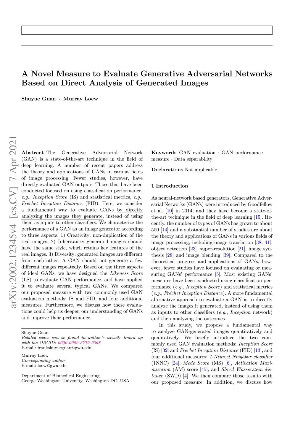 A Novel Measure to Evaluate Generative Adversarial Networks Based on