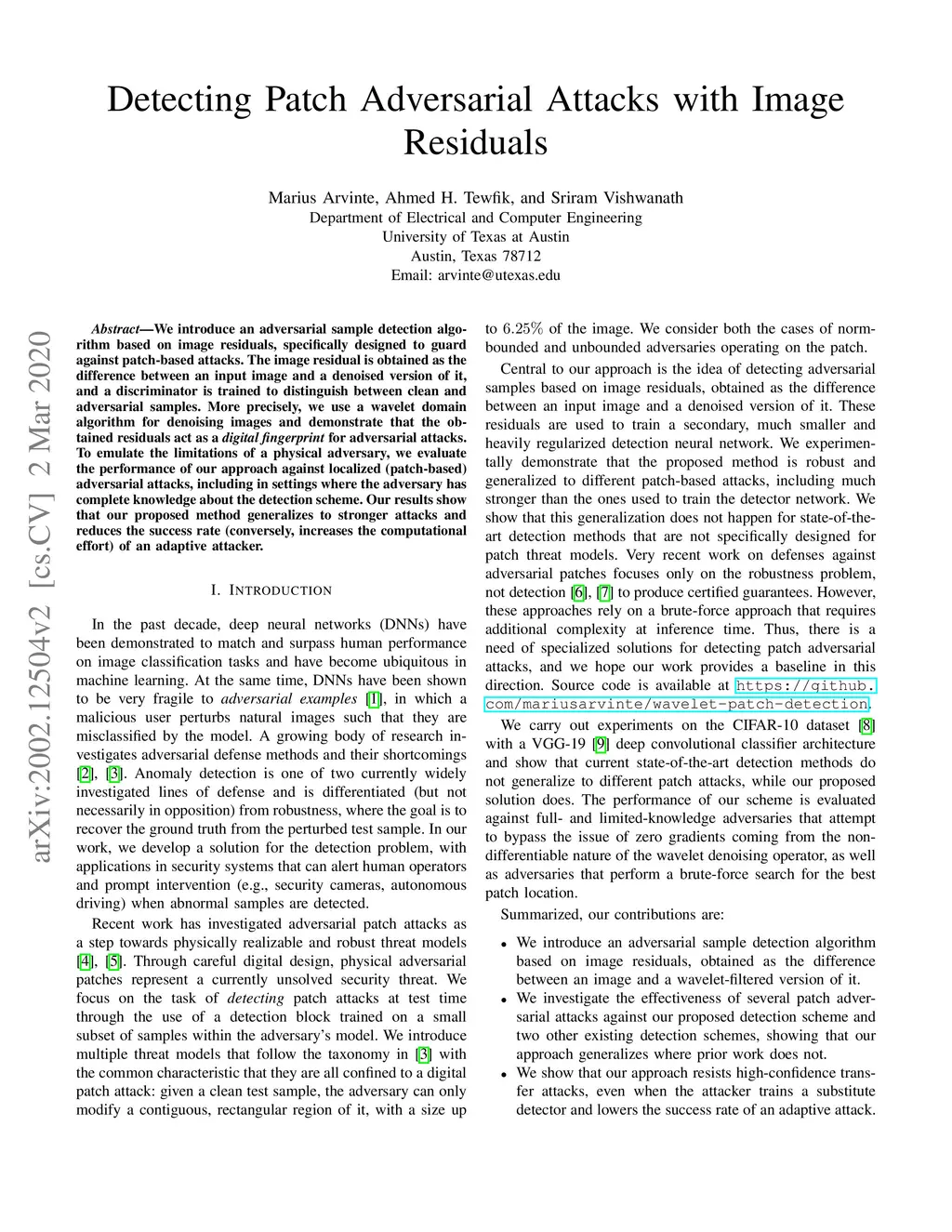 We introduce an adversarial sample detection algorithm based on image residuals, specifically designed to guard against patch-based attacks. The image residual is obtained as the difference between an input image and a denoised version of it, and a discriminator is trained to distinguish between clean and adversarial samples. More precisely, we use a wavelet domain algorithm for denoising images and demonstrate that the obtained residuals act as a digital fingerprint for adversarial attacks. To emulate the limitations of a physical adversary, we evaluate the performance of our approach against localized (patch-based) adversarial attacks, including in settings where the adversary has complete knowledge about the detection scheme. Our results show that the proposed detection method generalizes to previously unseen, stronger attacks and that it is able to reduce the success rate (conversely, increase the computational effort) of an adaptive attacker.