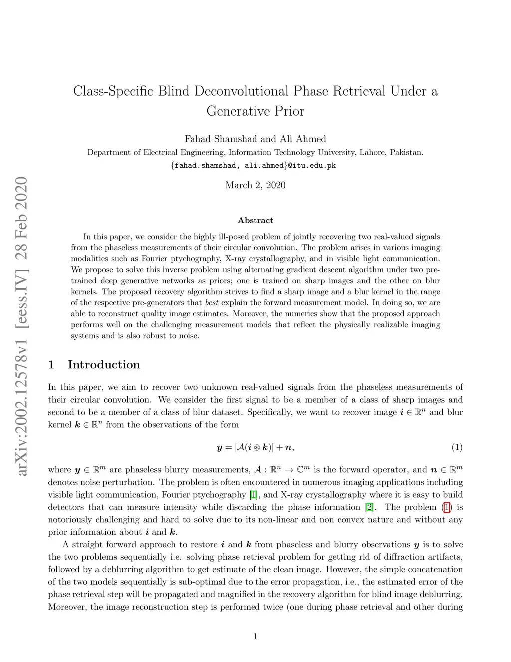 In this paper, we consider the highly ill-posed problem of jointly recovering two real-valued signals from the phaseless measurements of their circular convolution. The problem arises in various imaging modalities such as Fourier ptychography, X-ray crystallography, and in visible light communication. We propose to solve this inverse problem using alternating gradient descent algorithm under two pretrained deep generative networks as priors; one is trained on sharp images and the other on blur kernels. The proposed recovery algorithm strives to find a sharp image and a blur kernel in the range of the respective pre-generators that \textit{best} explain the forward measurement model. In doing so, we are able to reconstruct quality image estimates. Moreover, the numerics show that the proposed approach performs well on the challenging measurement models that reflect the physically realizable imaging systems and is also robust to noise