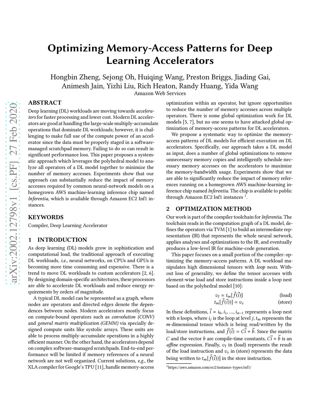 Deep learning (DL) workloads are moving towards accelerators for faster processing and lower cost. Modern DL accelerators are good at handling the large-scale multiply-accumulate operations that dominate DL workloads; however, it is challenging to make full use of the compute power of an accelerator since the data must be properly staged in a software-managed scratchpad memory. Failing to do so can result in significant performance loss. This paper proposes a systematic approach which leverages the polyhedral model to analyze all operators of a DL model together to minimize the number of memory accesses. Experiments show that our approach can substantially reduce the impact of memory accesses required by common neural-network models on a homegrown AWS machine-learning inference chip named Inferentia, which is available through Amazon EC2 Inf1 instances.