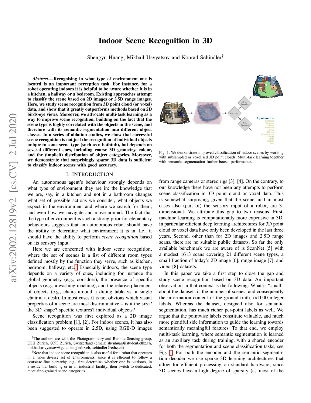 Recognising in what type of environment one is located is an important perception task. For instance, for a robot operating in indoors it is helpful to be aware whether it is in a kitchen, a hallway or a bedroom. Existing approaches attempt to classify the scene based on 2D images or 2.5D range images. Here, we study scene recognition from 3D point cloud (or voxel) data, and show that it greatly outperforms methods based on 2D birds-eye views. Moreover, we advocate multi-task learning as a way of improving scene recognition, building on the fact that the scene type is highly correlated with the objects in the scene, and therefore with its semantic segmentation into different object classes. In a series of ablation studies, we show that successful scene recognition is not just the recognition of individual objects unique to some scene type (such as a bathtub), but depends on several different cues, including coarse 3D geometry, colour, and the (implicit) distribution of object categories. Moreover, we demonstrate that surprisingly sparse 3D data is sufficient to classify indoor scenes with good accuracy.