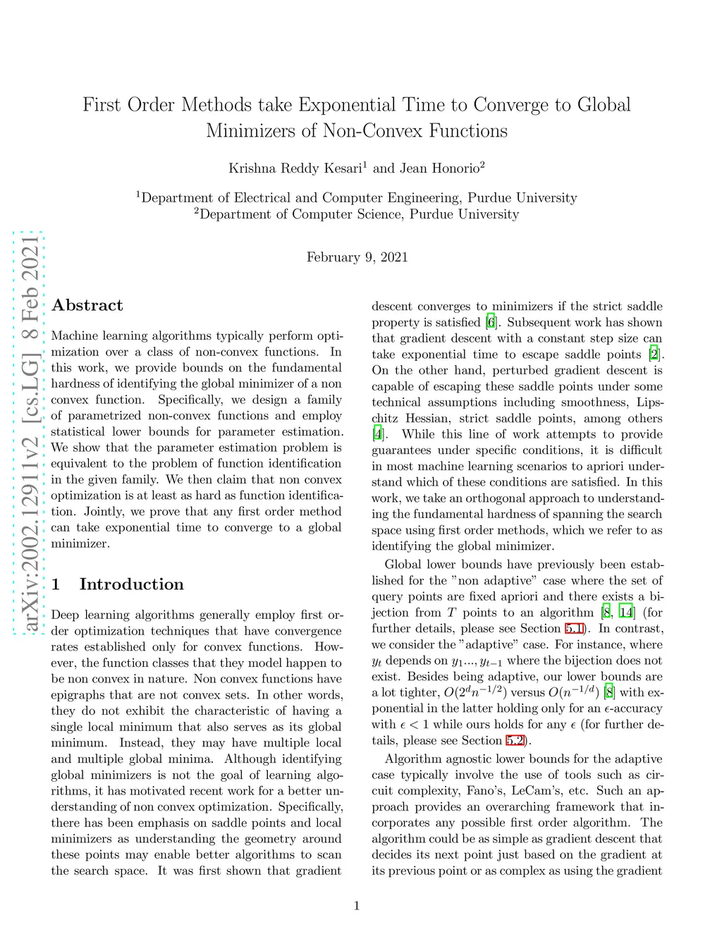 Machine learning algorithms typically perform optimization over a class of non-convex functions. In this work, we provide bounds on the fundamental hardness of identifying the global minimizer of a non convex function. Specifically, we design a family of parametrized non-convex functions and employ statistical lower bounds for parameter estimation. We show that the parameter estimation problem is equivalent to the problem of function identification in the given family. We then claim that non convex optimization is at least as hard as function identification. Jointly, we prove that any first order method can take exponential time to converge to a global minimizer.