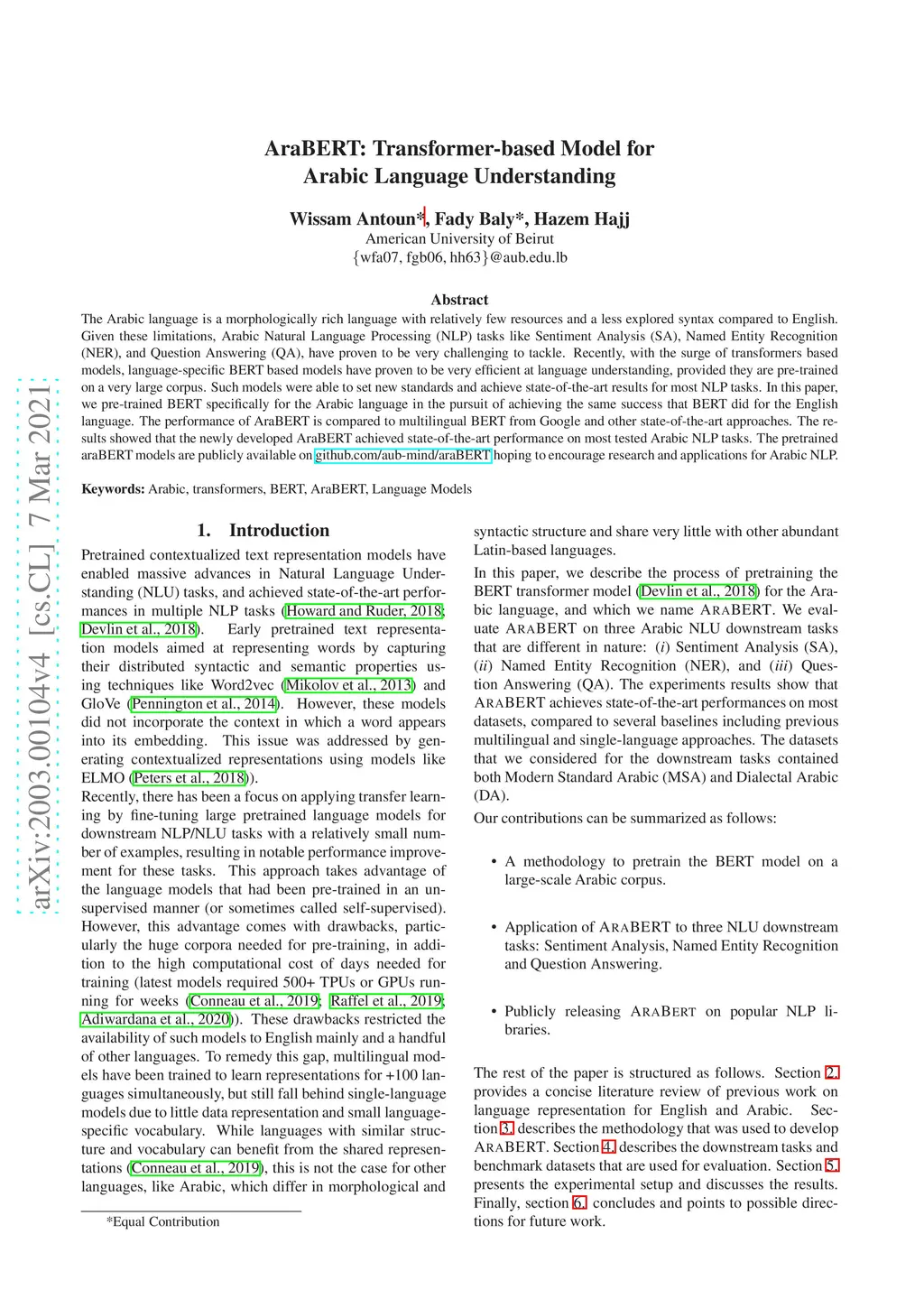 AraBERT: Transformer-based Model for Arabic Language Understanding