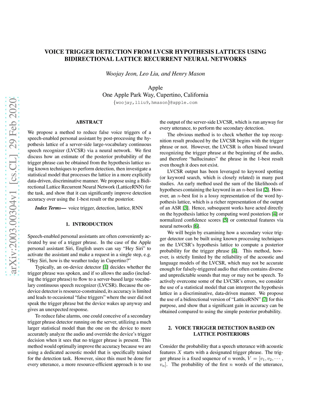We propose a method to reduce false voice triggers of a speech-enabled personal assistant by post-processing the hypothesis lattice of a server-side large-vocabulary continuous speech recognizer (LVCSR) via a neural network. We first discuss how an estimate of the posterior probability of the trigger phrase can be obtained from the hypothesis lattice using known techniques to perform detection, then investigate a statistical model that processes the lattice in a more explicitly data-driven, discriminative manner. We propose using a Bidirectional Lattice Recurrent Neural Network (LatticeRNN) for the task, and show that it can significantly improve detection accuracy over using the 1-best result or the posterior.